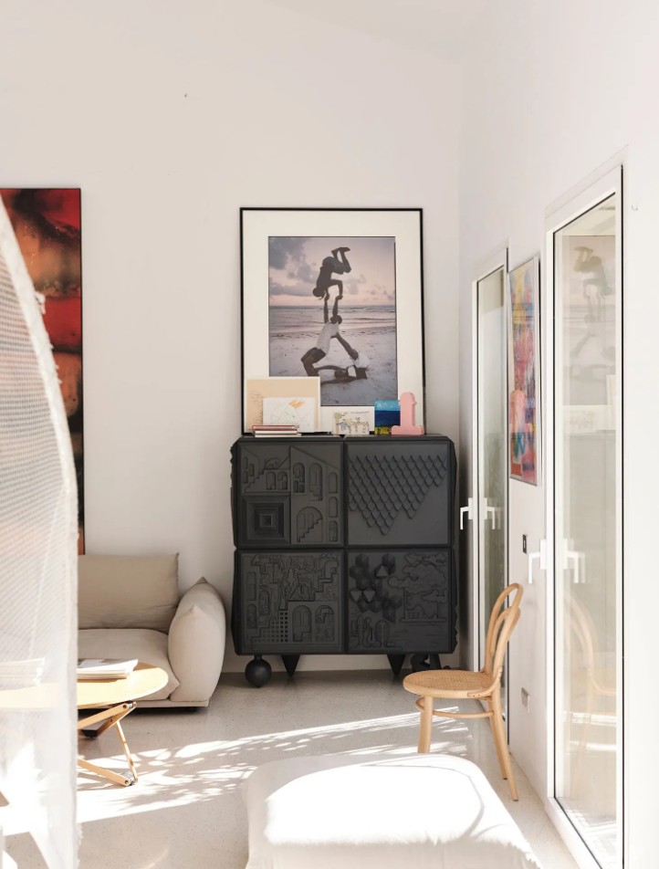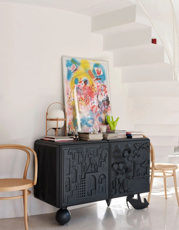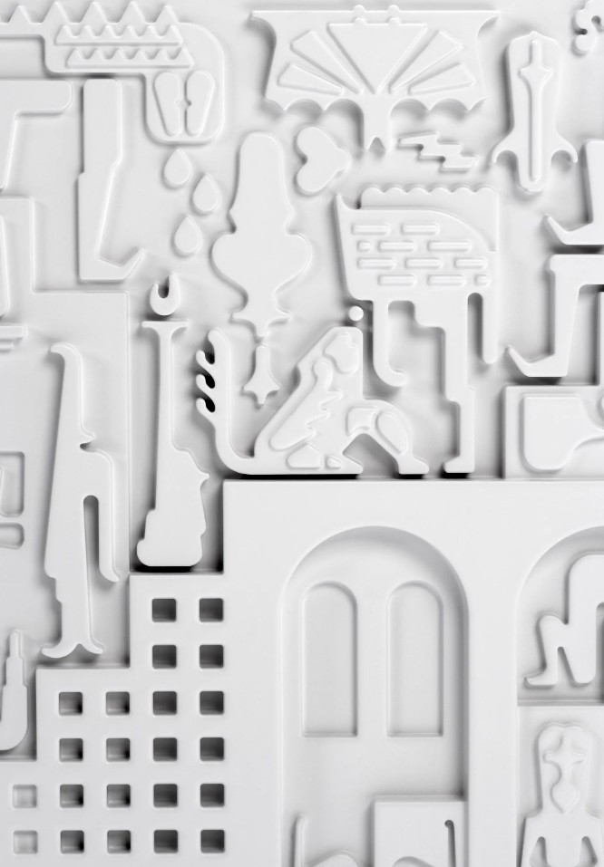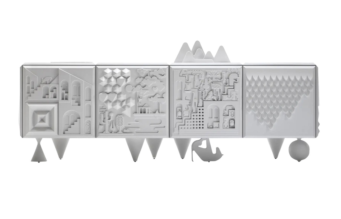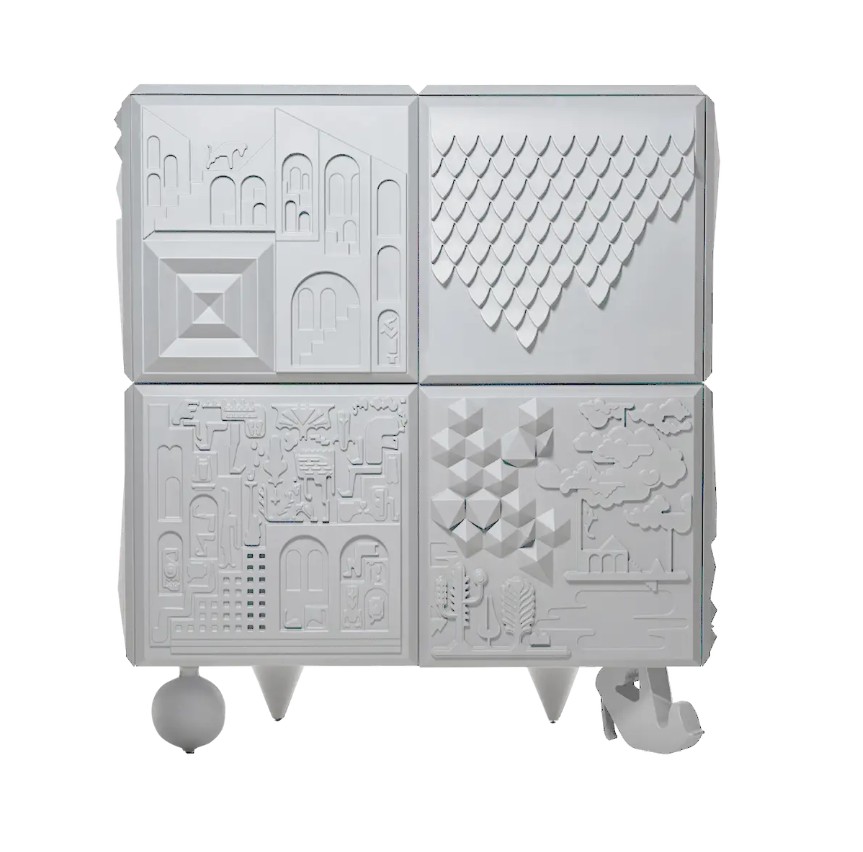 Sochařské dílo plné textur, symbolů a fantazie. Povrch pokrývají reliéfní motivy inspirované uměním, hieroglyfy a optimistickými příběhy, díky nimž se z komody stává vizuální zážitek i dotyková zkušenost.