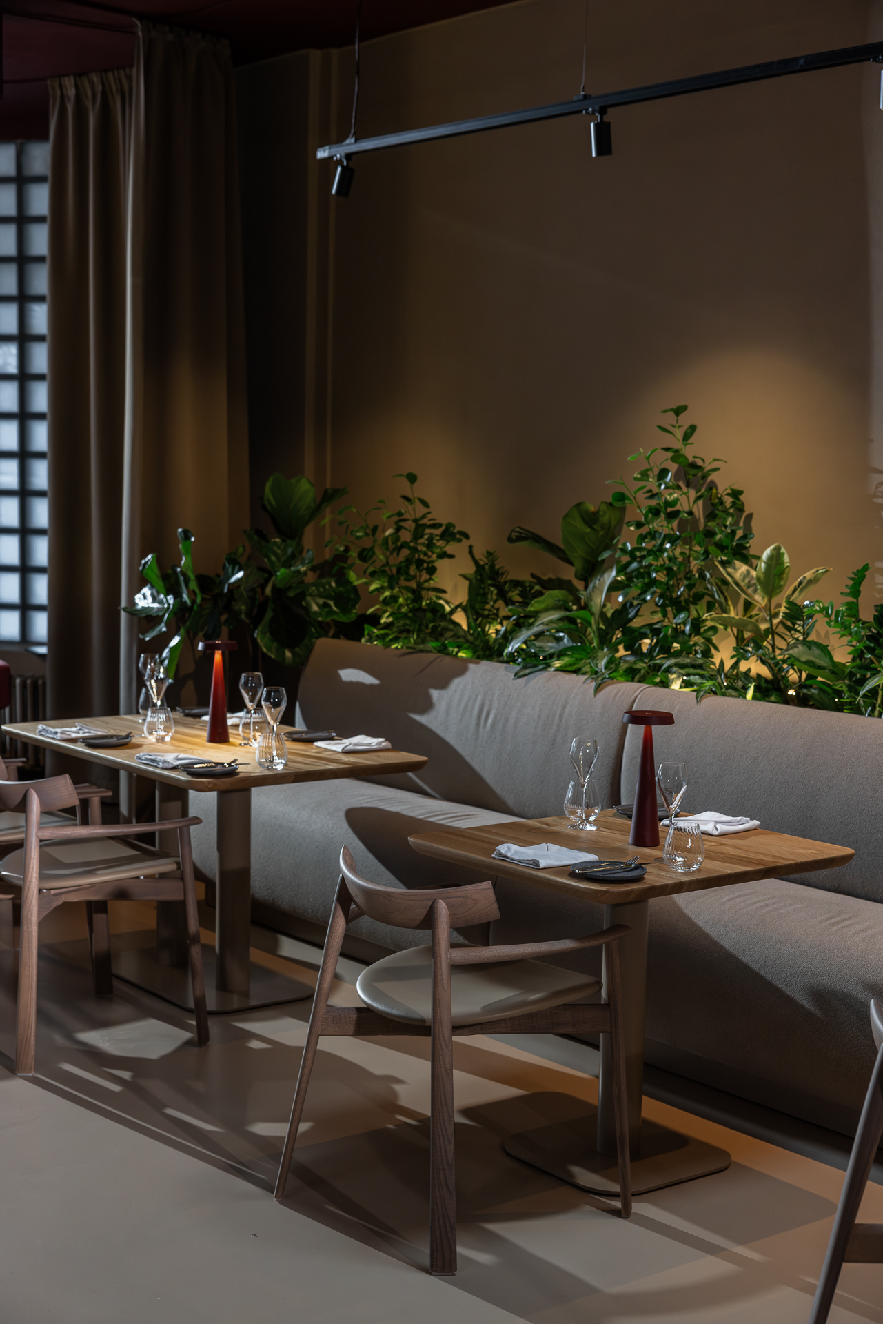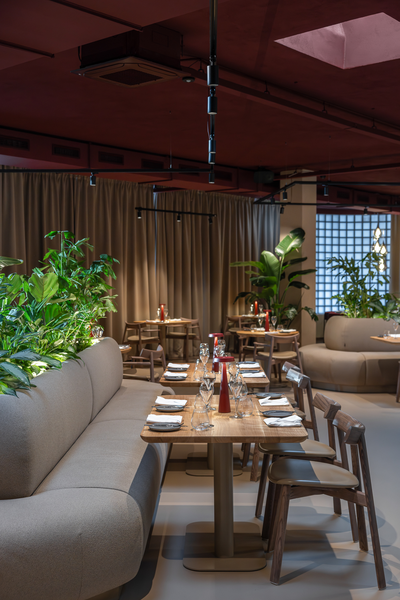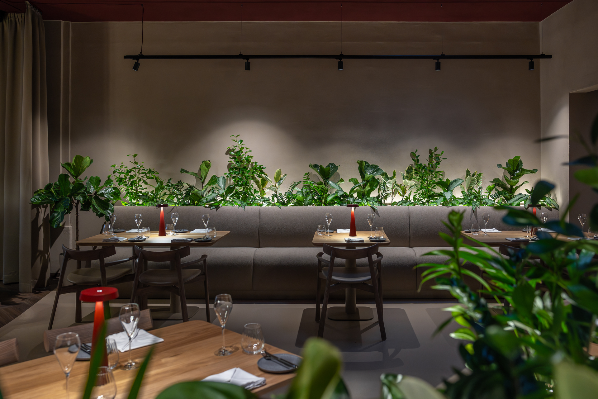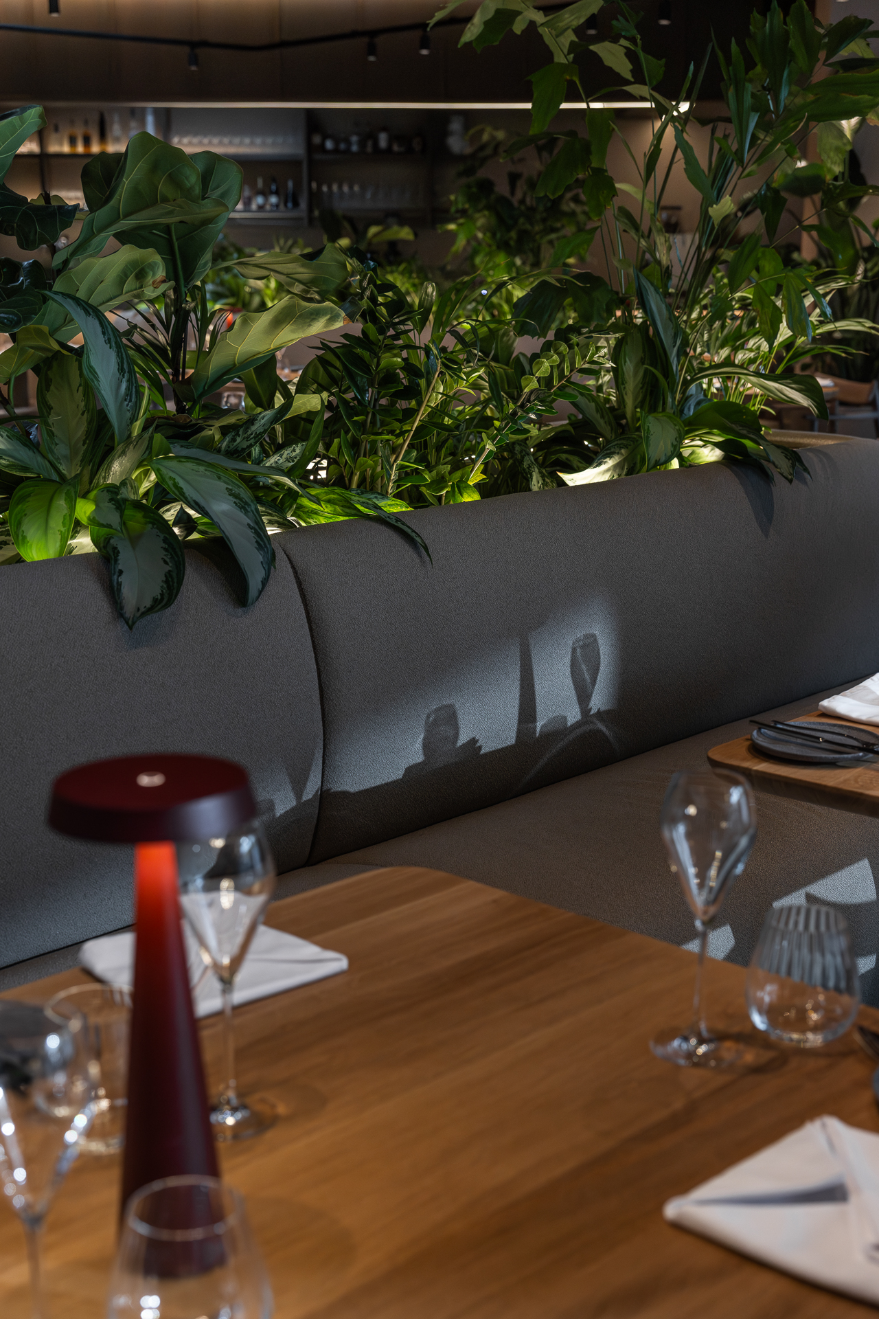 Jedním z hlavních prvků je strop v hluboké bordó barvě, která odkazuje na tradiční červenou symbolizující štěstí, životní sílu a radost. V prostoru působí klidně, elegantně a dodává mu hloubku i lehký nádech tajemna. Významnou roli hrají také rostliny – přirozeně oddělují jednotlivé zóny, doplňují lavice zezadu a přinášejí do interiéru svěžest a lehkost.