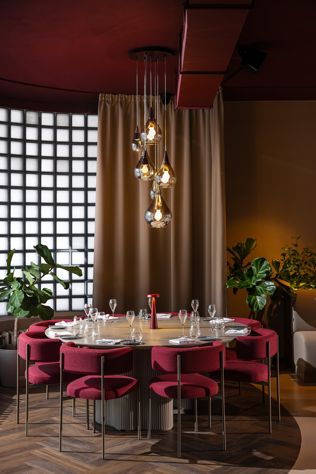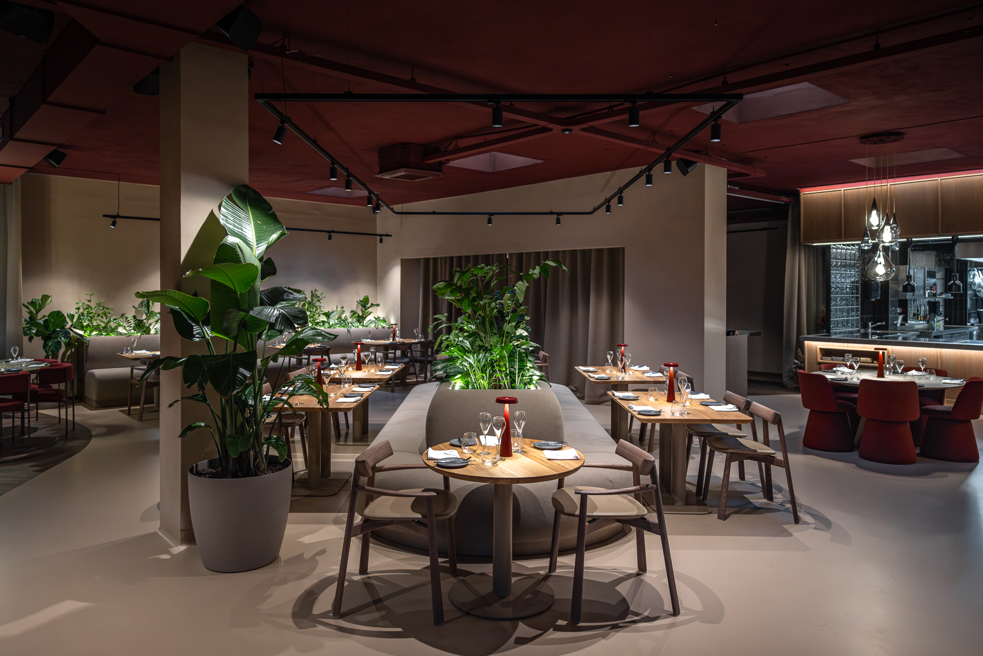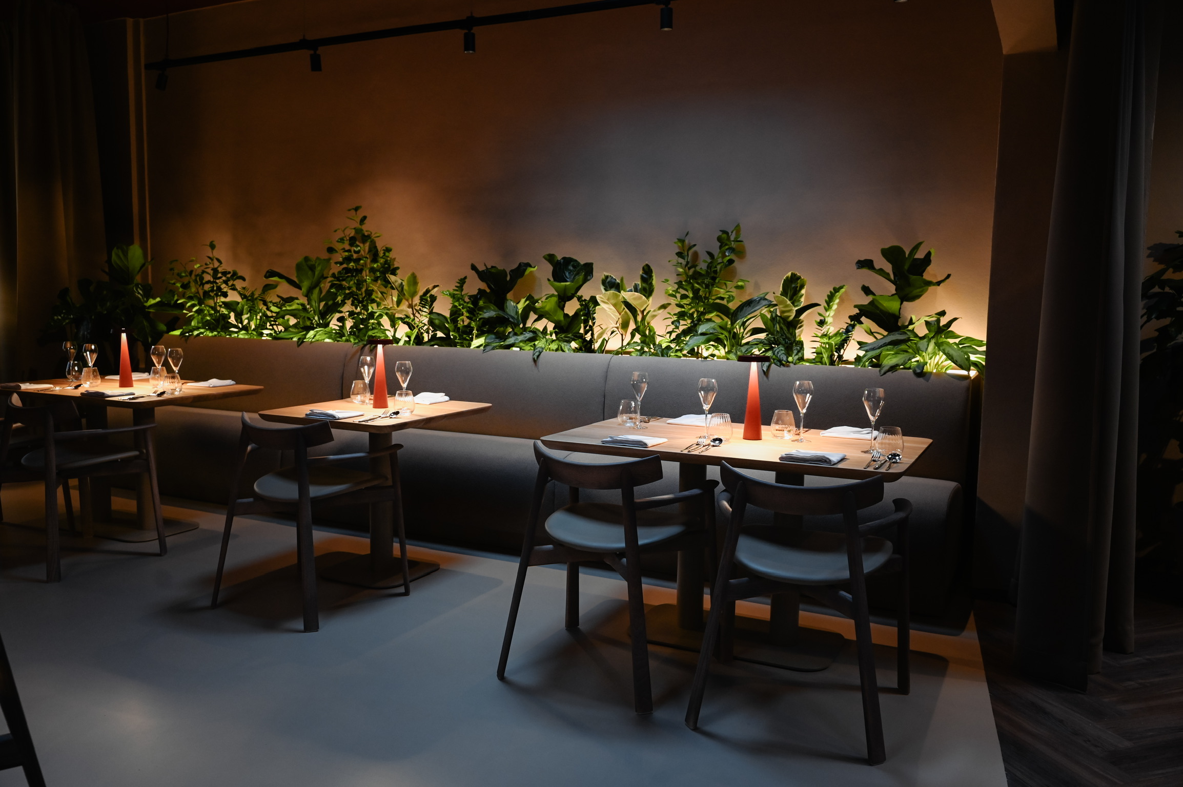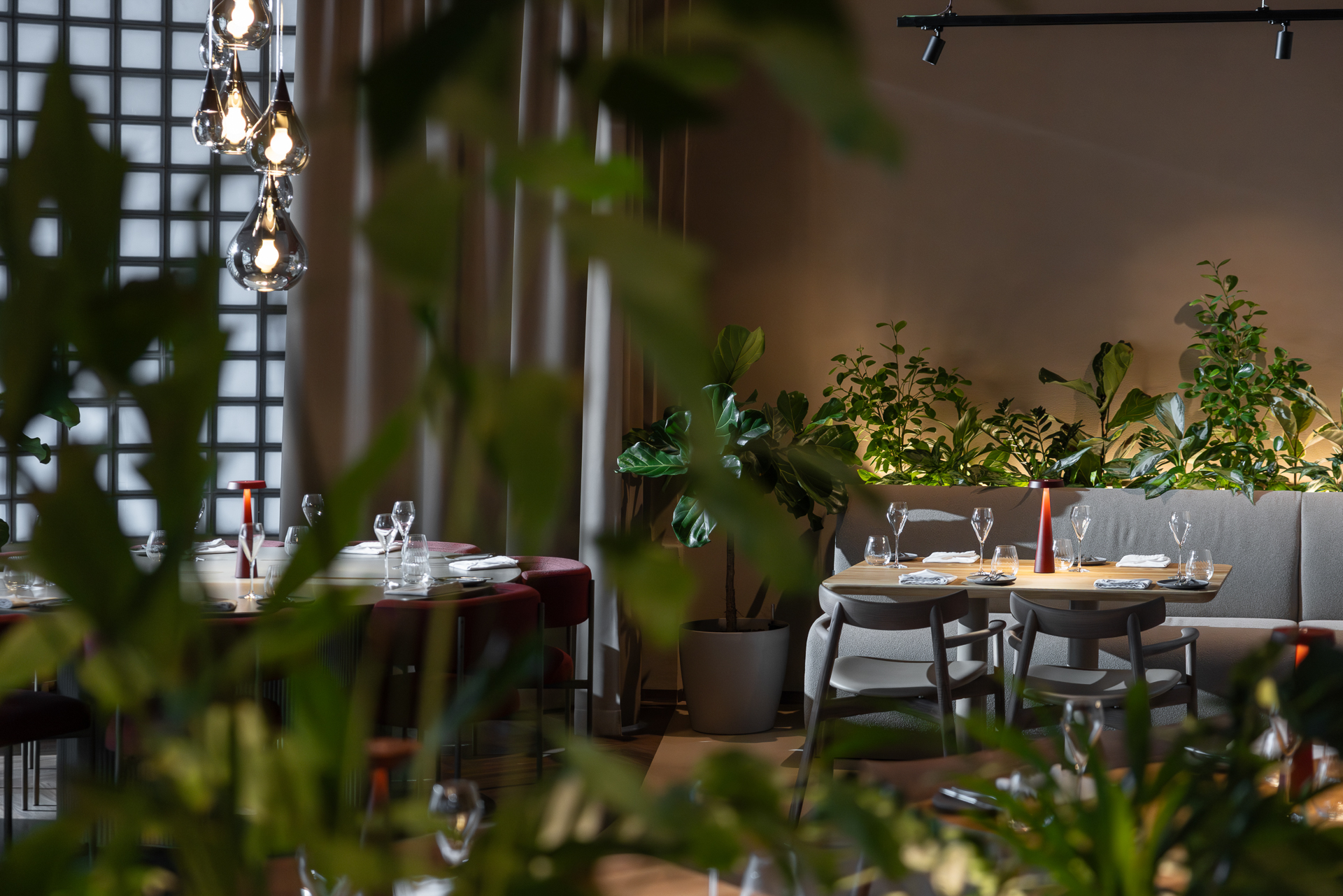 Jedním z hlavních prvků je strop v hluboké bordó barvě, která odkazuje na tradiční červenou symbolizující štěstí, životní sílu a radost. V prostoru působí klidně, elegantně a dodává mu hloubku i lehký nádech tajemna. Významnou roli hrají také rostliny – přirozeně oddělují jednotlivé zóny, doplňují lavice zezadu a přinášejí do interiéru svěžest a lehkost.