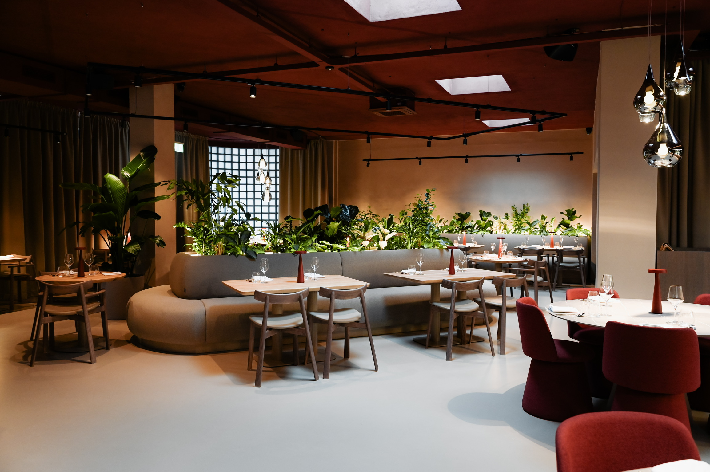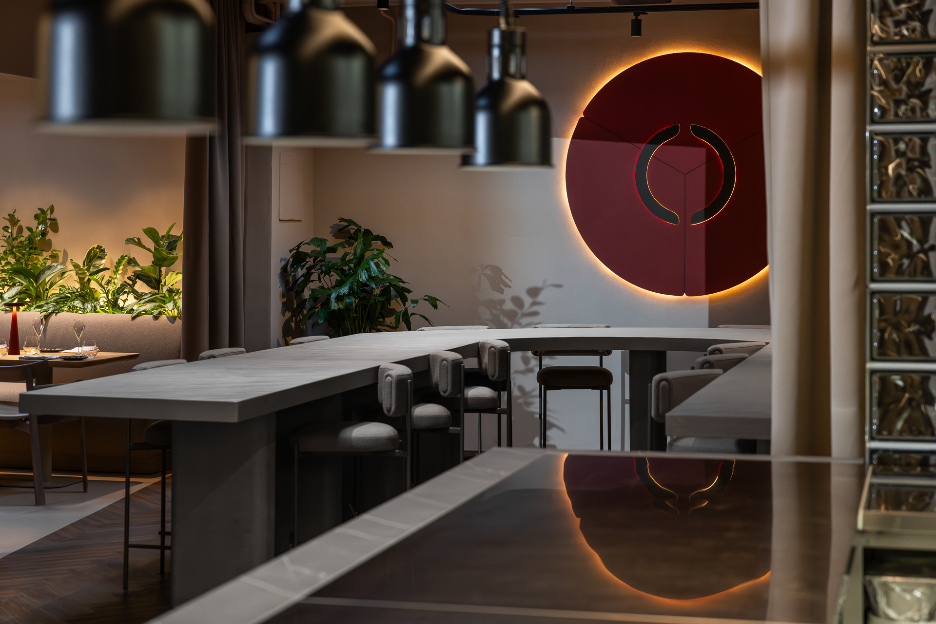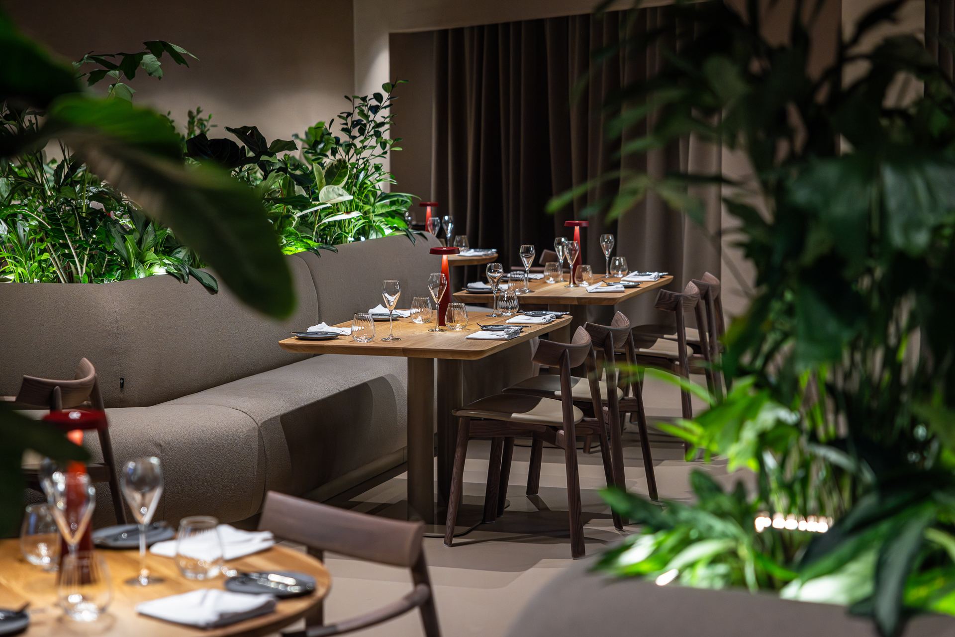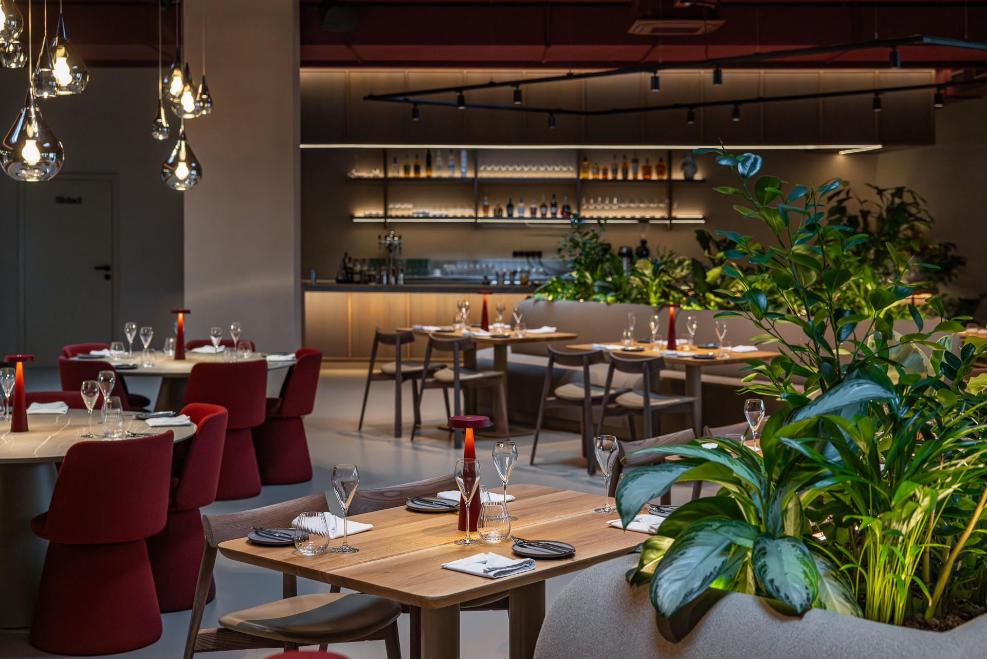 Jedním z hlavních prvků je strop v hluboké bordó barvě, která odkazuje na tradiční červenou symbolizující štěstí, životní sílu a radost. V prostoru působí klidně, elegantně a dodává mu hloubku i lehký nádech tajemna. Významnou roli hrají také rostliny – přirozeně oddělují jednotlivé zóny, doplňují lavice zezadu a přinášejí do interiéru svěžest a lehkost.