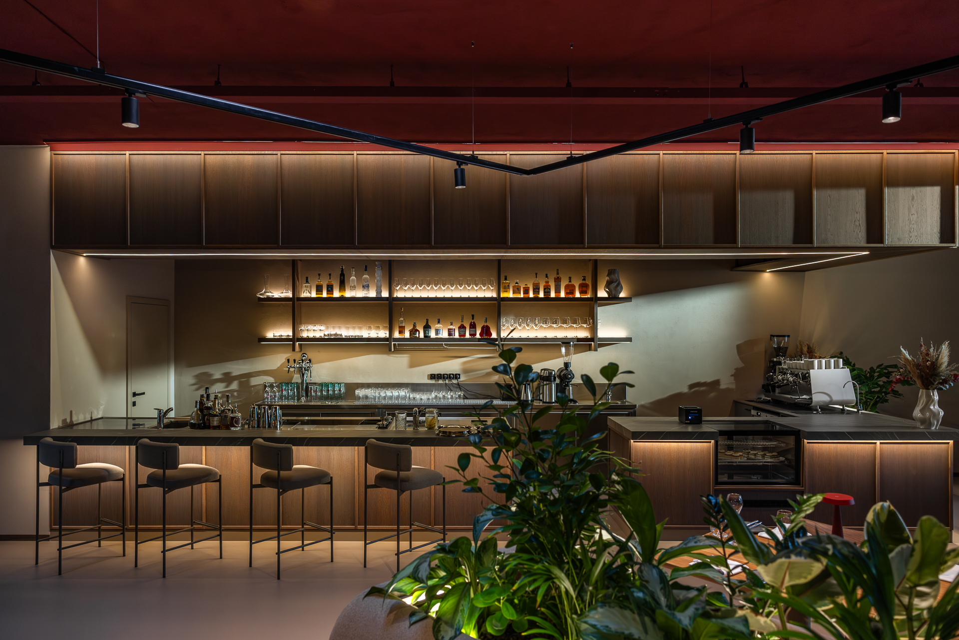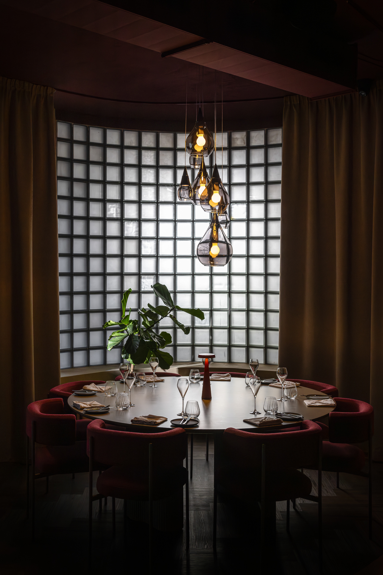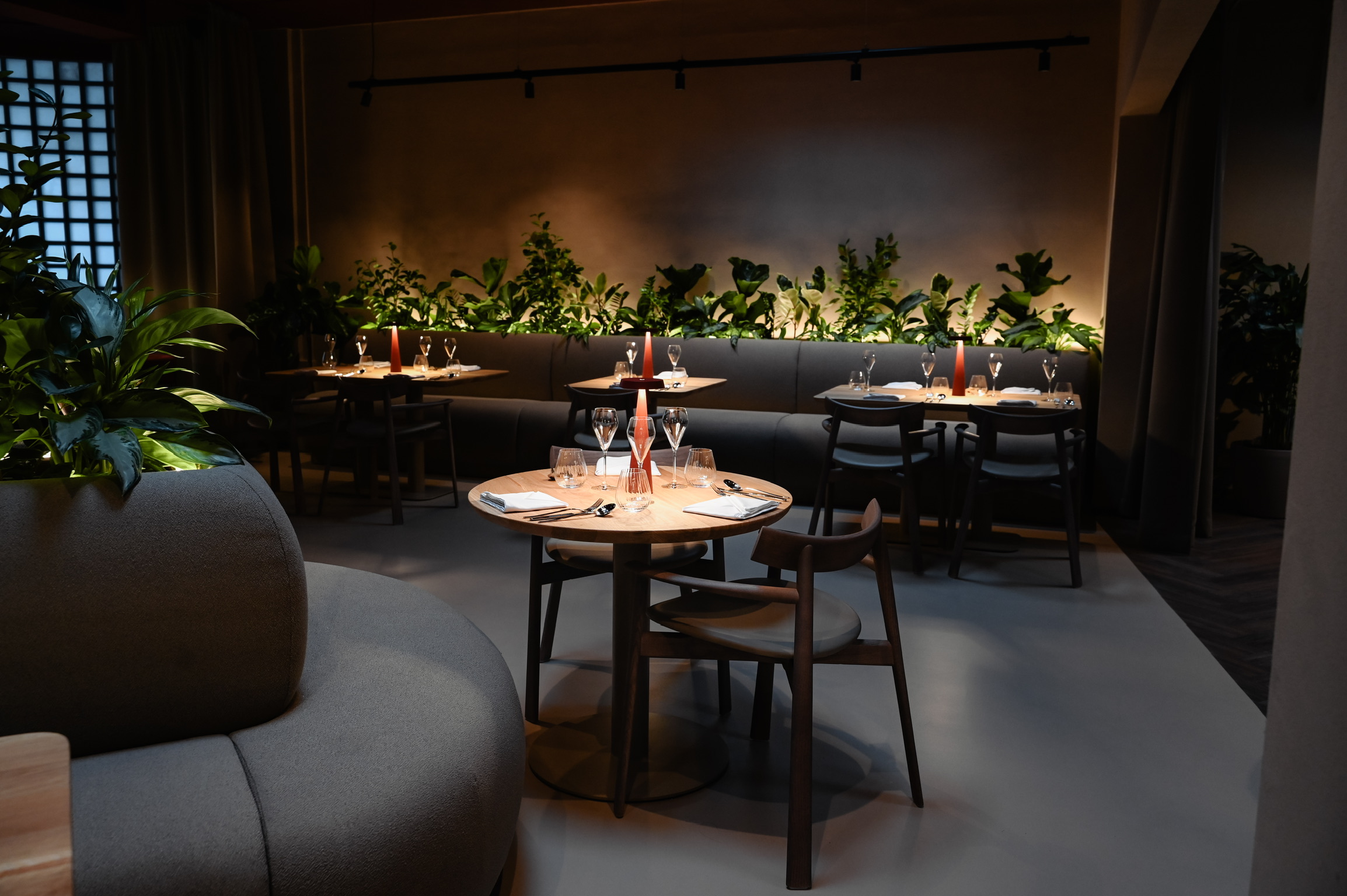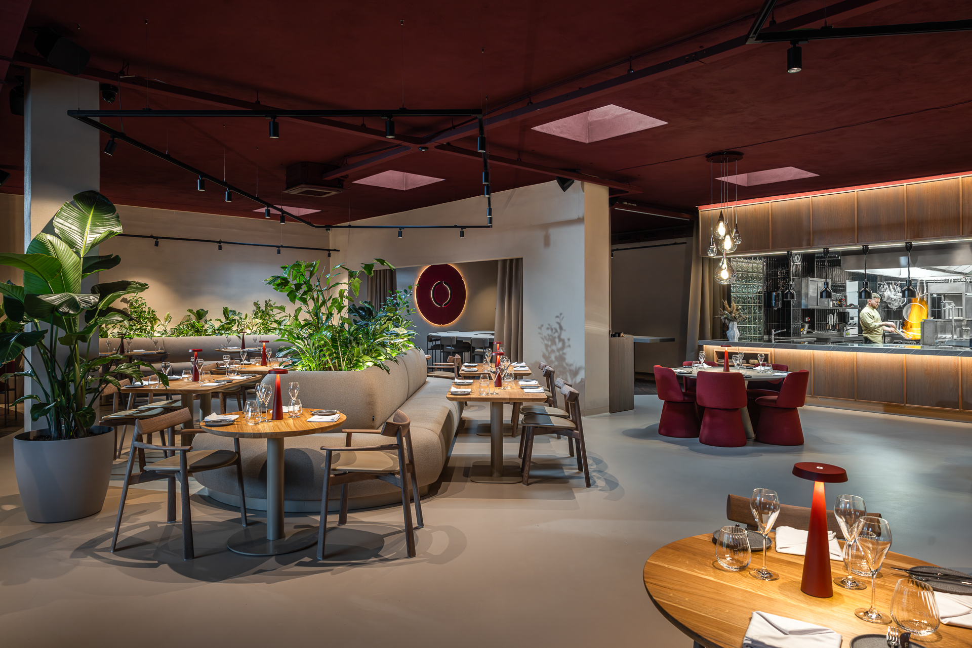Jedním z hlavních prvků je strop v hluboké bordó barvě, která odkazuje na tradiční červenou symbolizující štěstí, životní sílu a radost. V prostoru působí klidně, elegantně a dodává mu hloubku i lehký nádech tajemna. Významnou roli hrají také rostliny – přirozeně oddělují jednotlivé zóny, doplňují lavice zezadu a přinášejí do interiéru svěžest a lehkost.