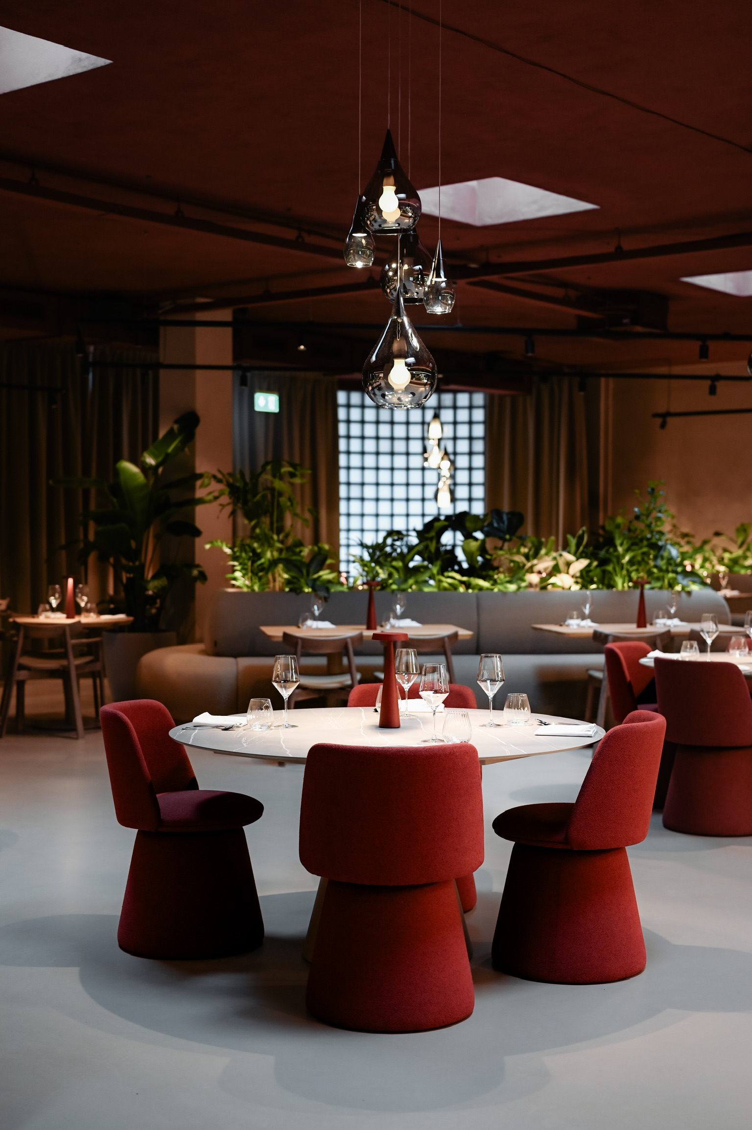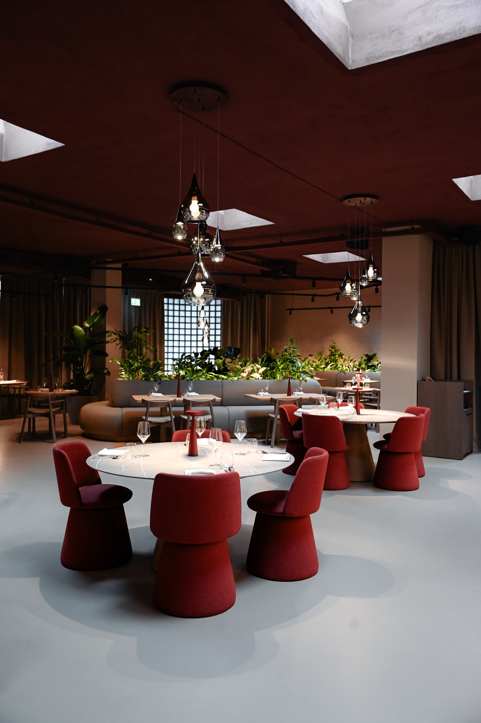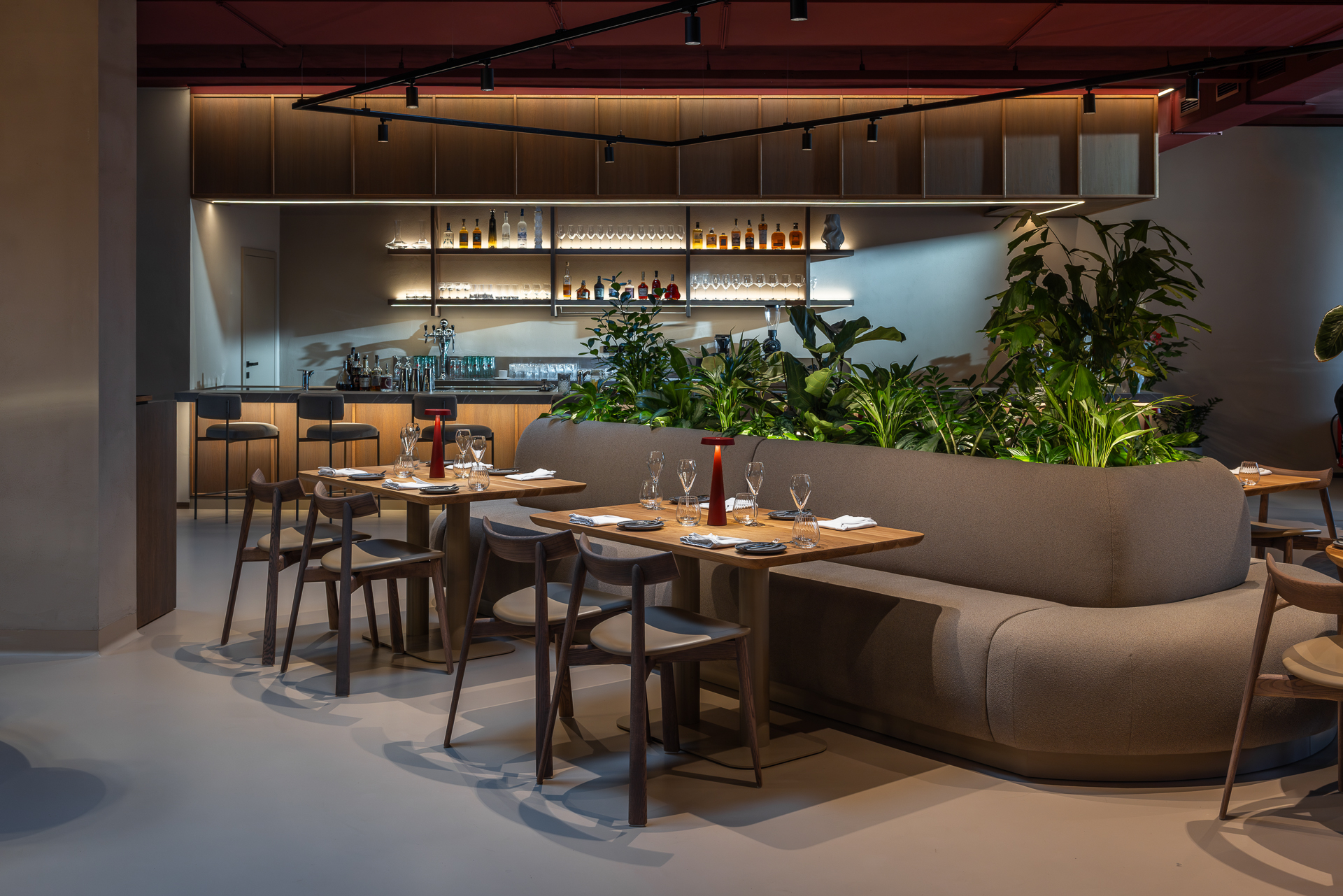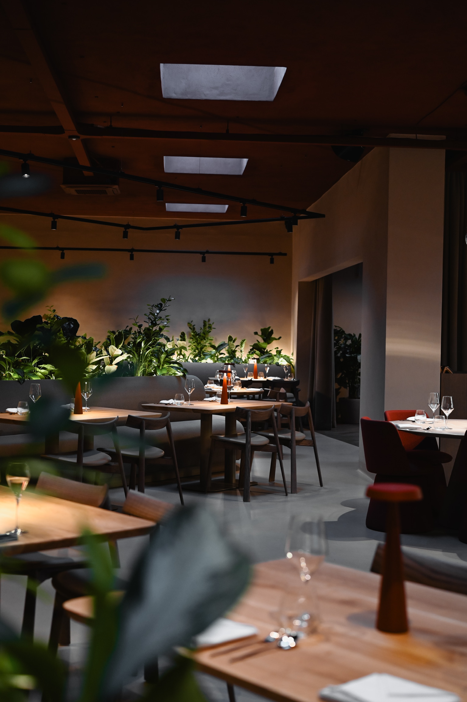 Interiér je členěn do několika zón reagujících na různé potřeby hostů – od intimních stolů přes společné lavice až po výrazný velký stůl ve tvaru U, který slouží pro kurzy, školení nebo komunitní sezení. Díky svému tvaru a umístění podporuje přirozenou interakci a sdílení – ideální pro ty, kdo chtějí jídlo zažít jako společenskou událost.