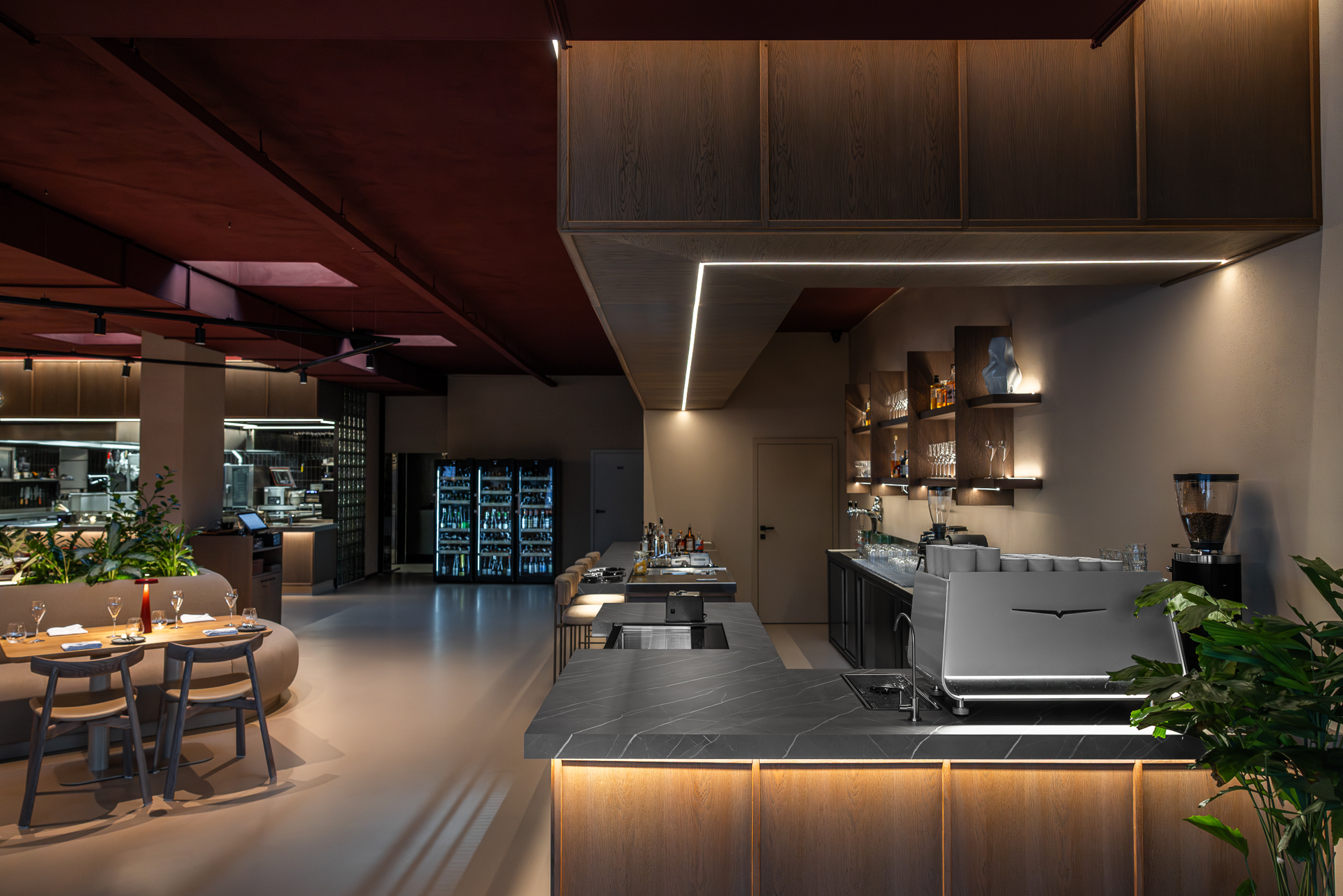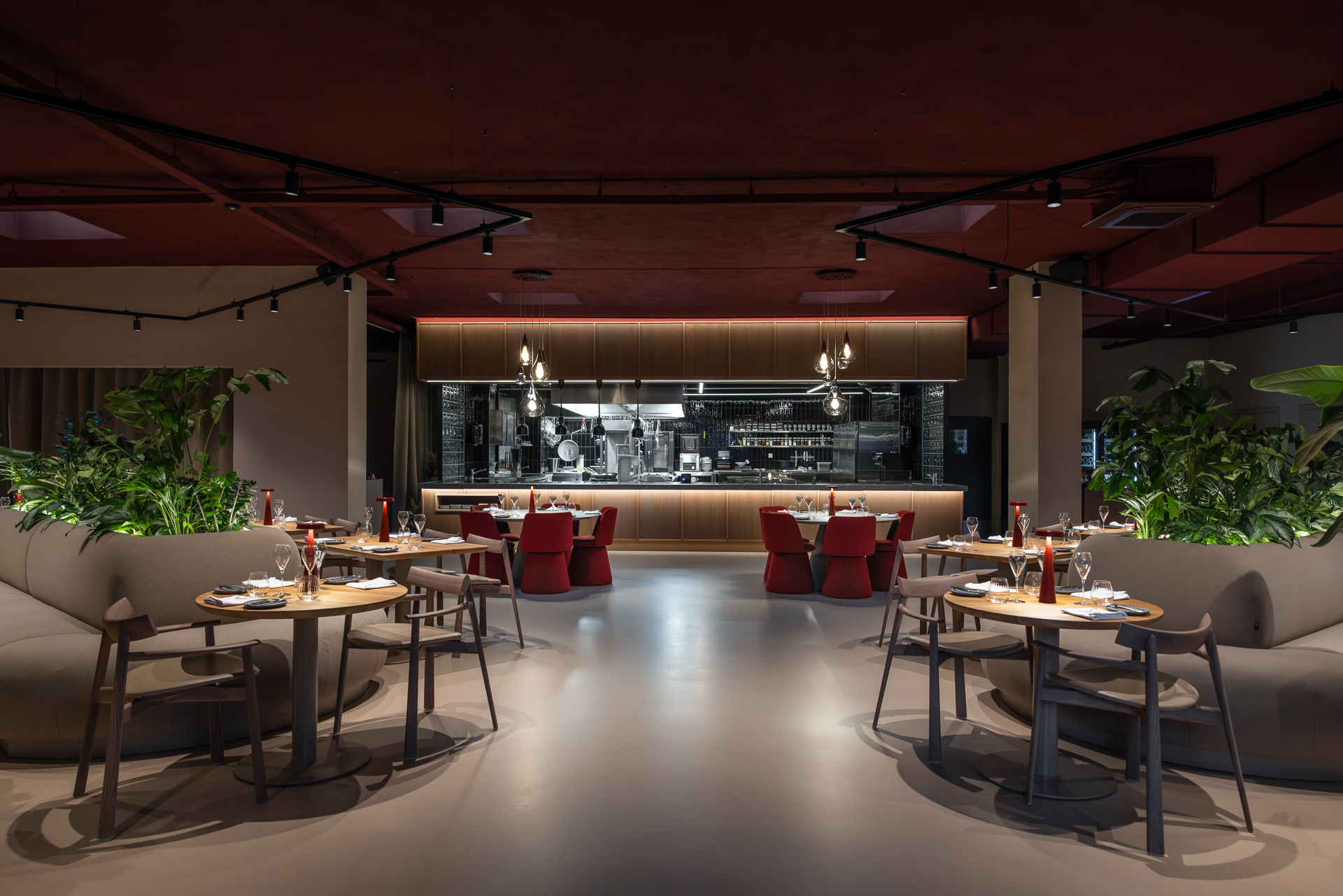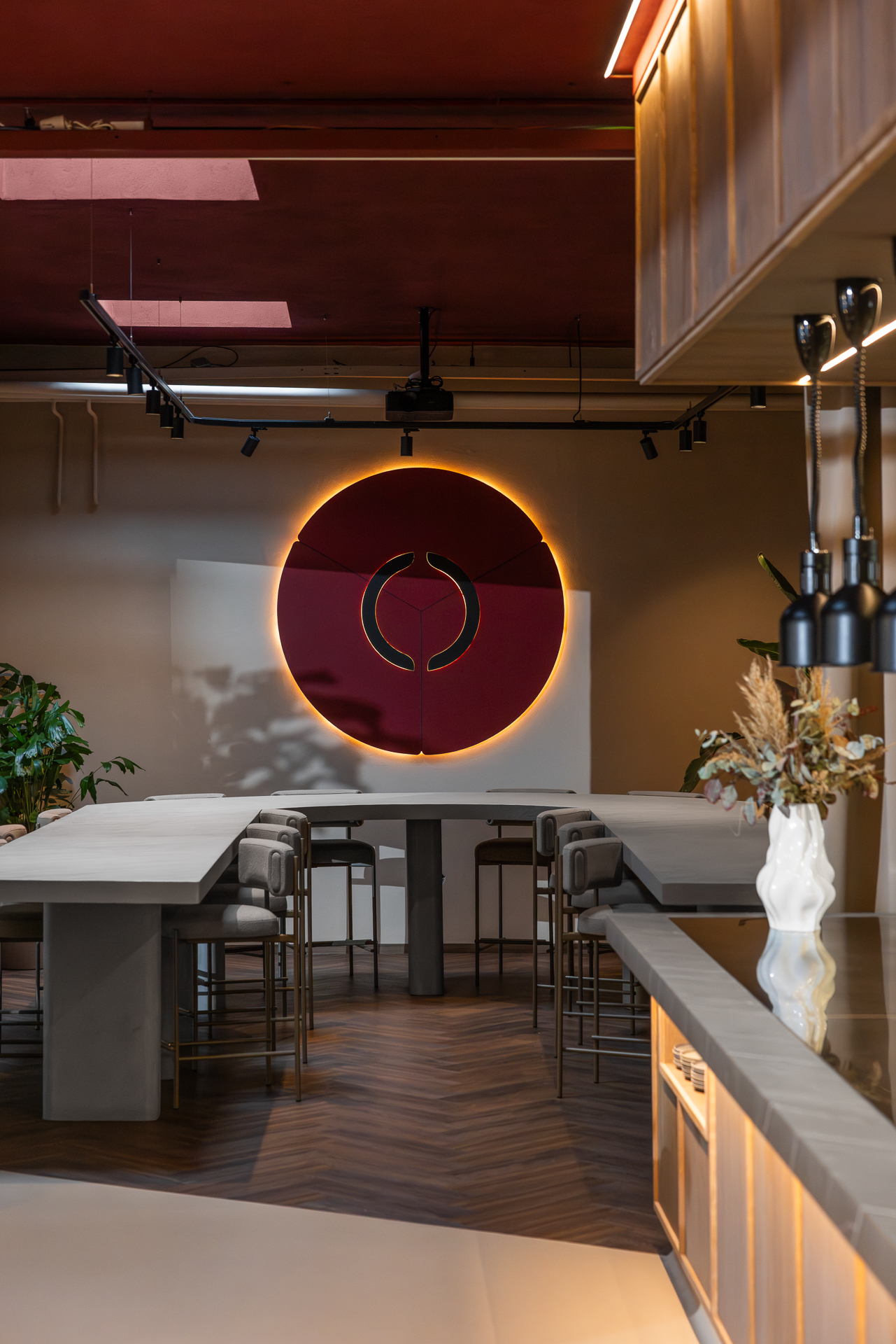 Interiér je členěn do několika zón reagujících na různé potřeby hostů – od intimních stolů přes společné lavice až po výrazný velký stůl ve tvaru U, který slouží pro kurzy, školení nebo komunitní sezení. Díky svému tvaru a umístění podporuje přirozenou interakci a sdílení – ideální pro ty, kdo chtějí jídlo zažít jako společenskou událost.