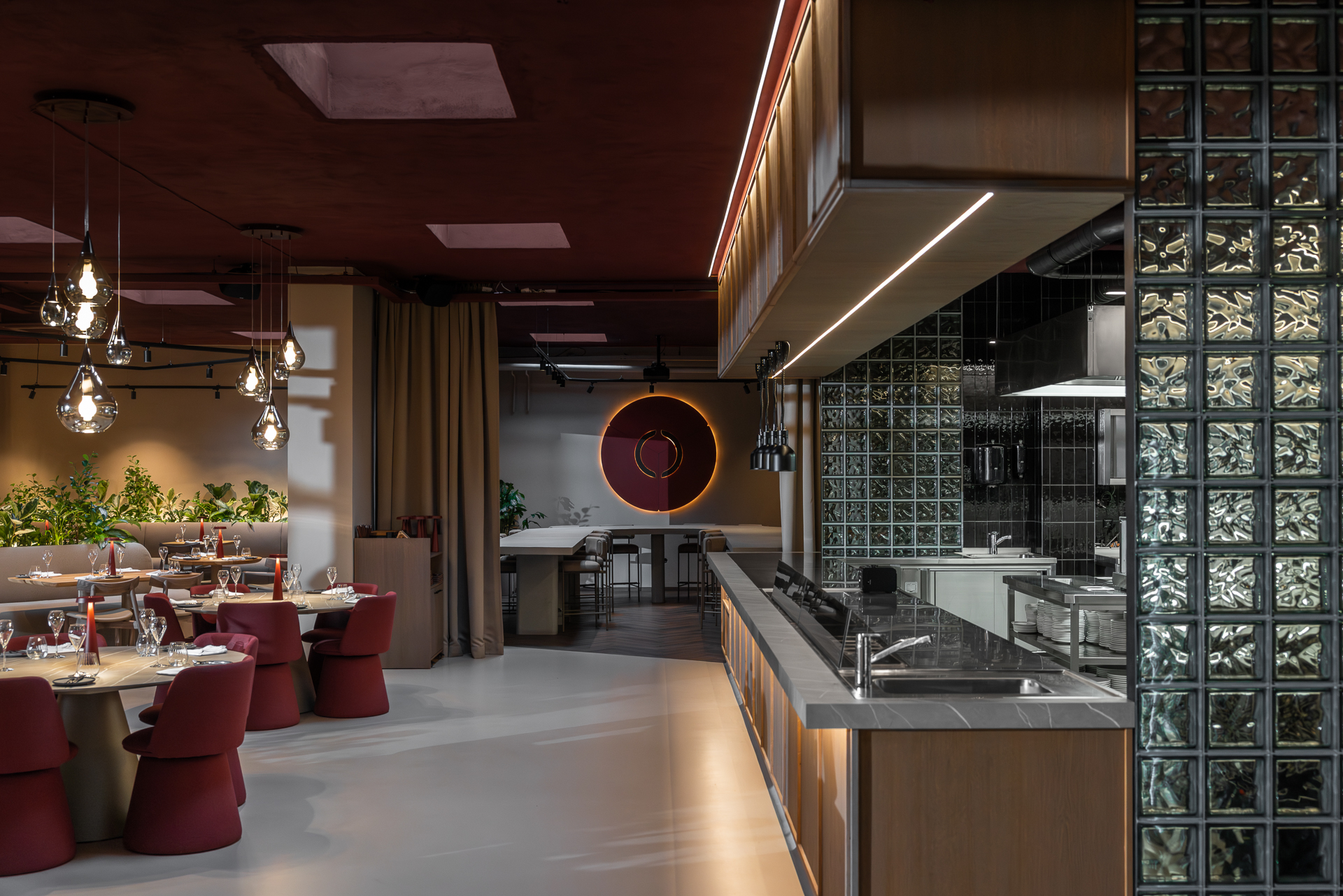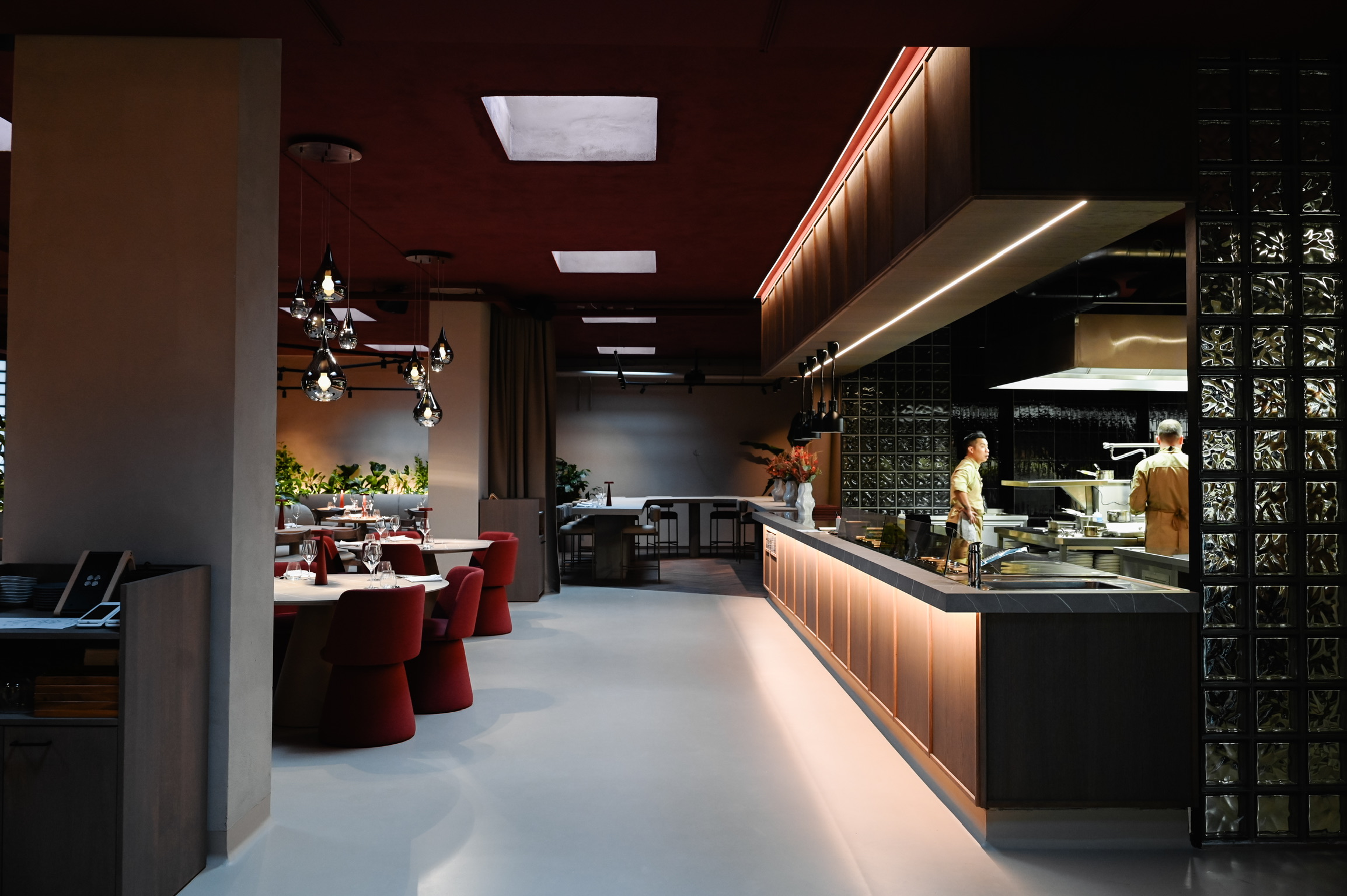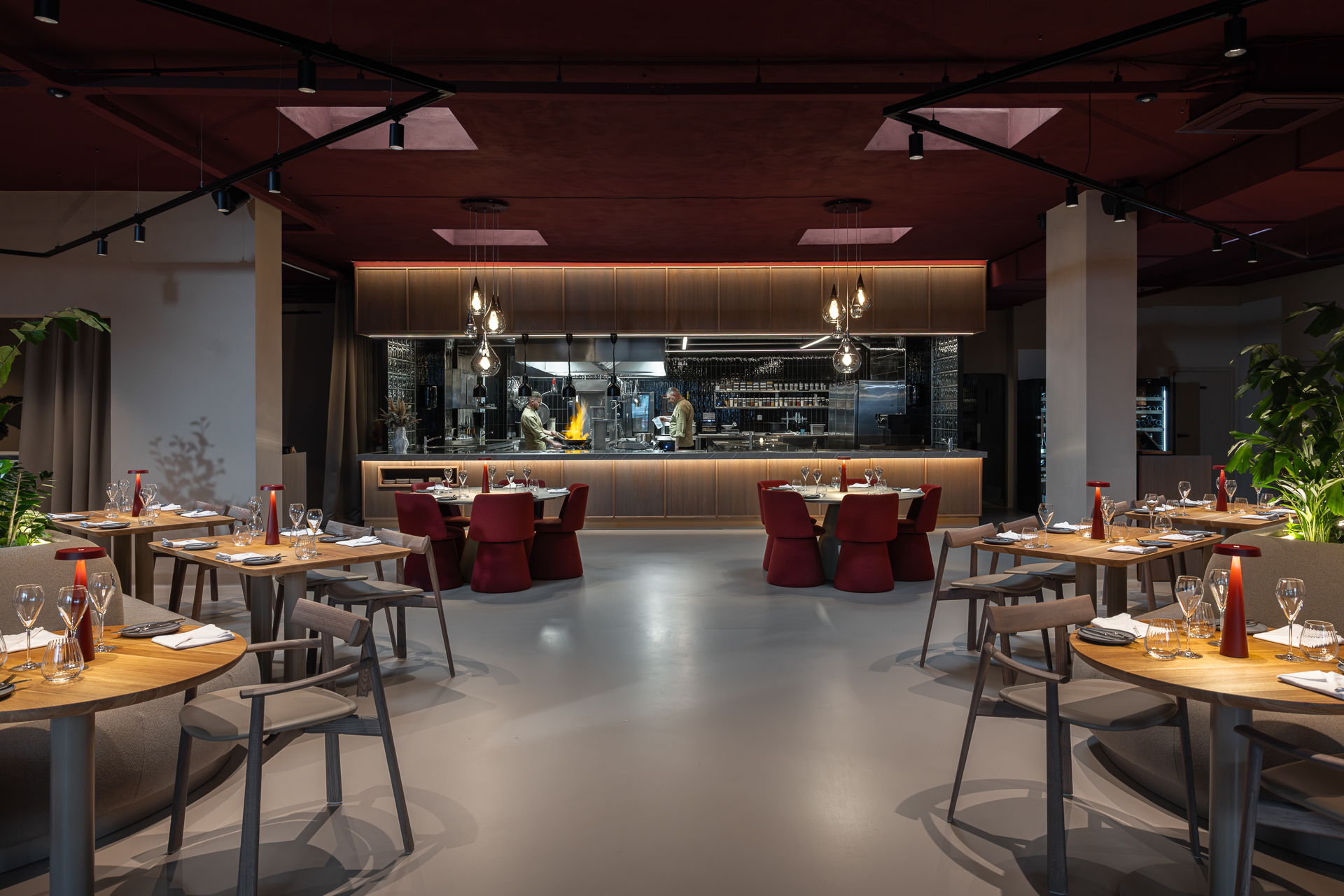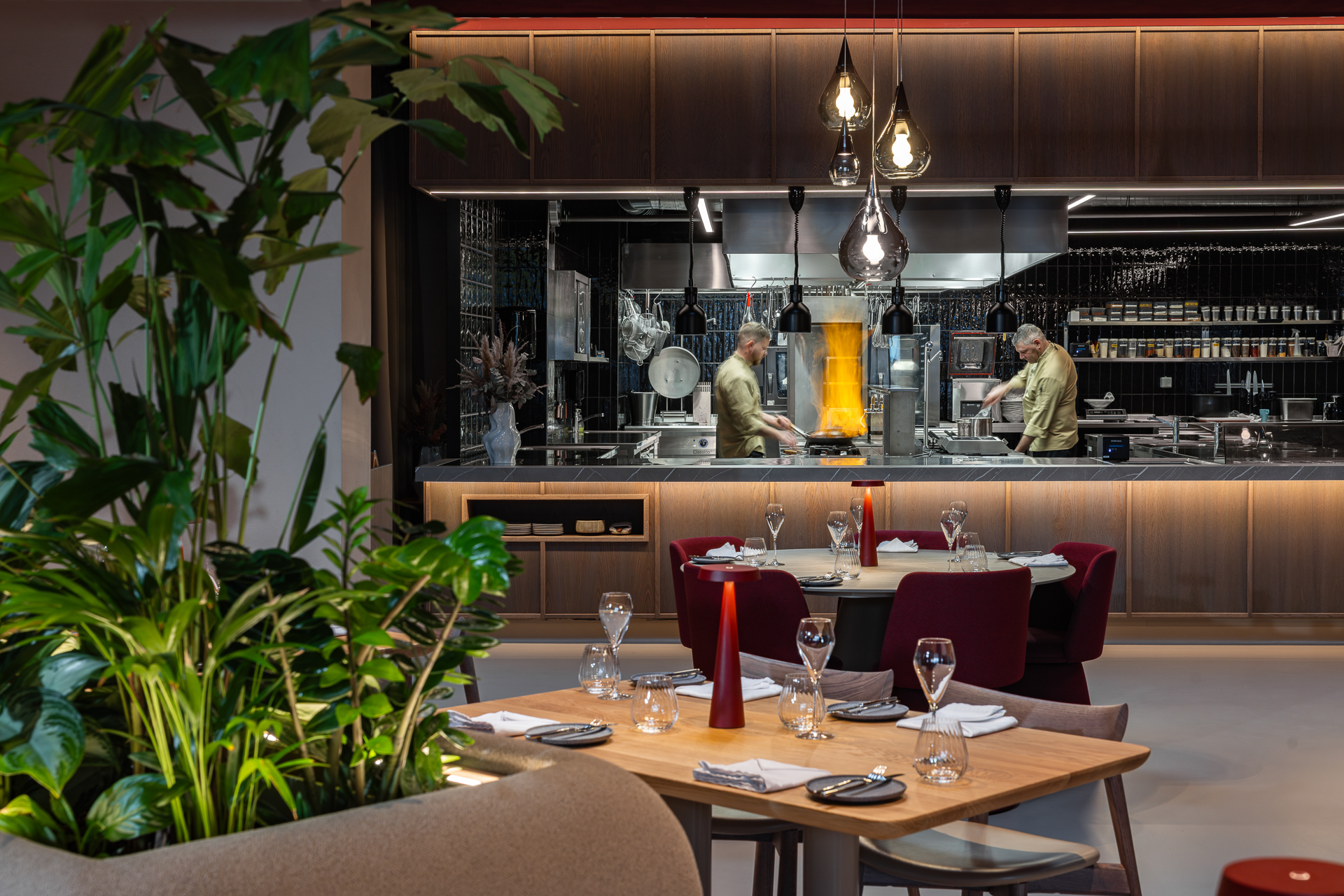 Dominantou prostoru je otevřená kuchyně, která je doslova středobodem dění. Výhled na ni rámují dvě lavice, které přirozeně vedou pozornost tím správným směrem. Kuchyně není schovaná – je to srdce celé restaurace.