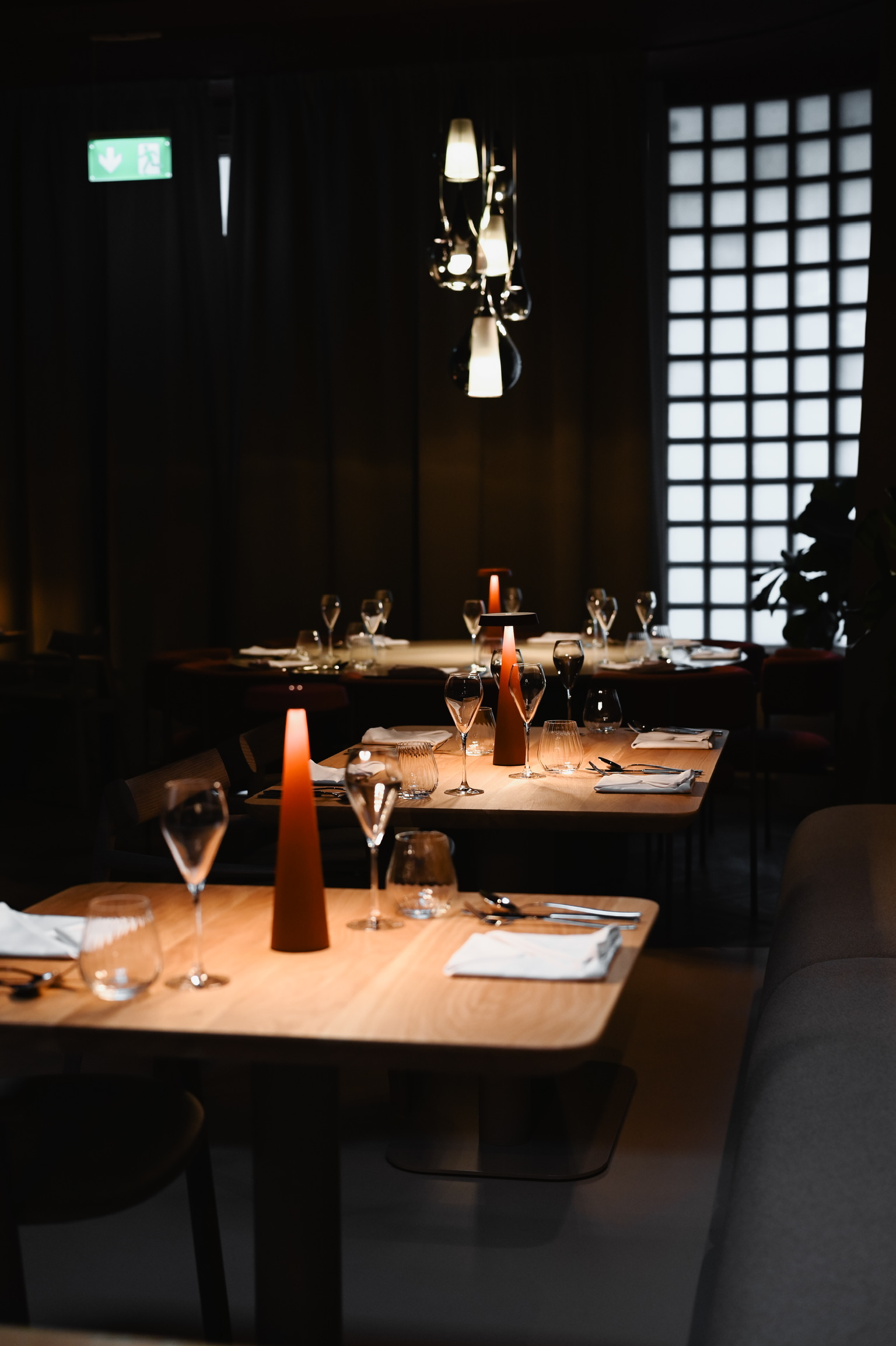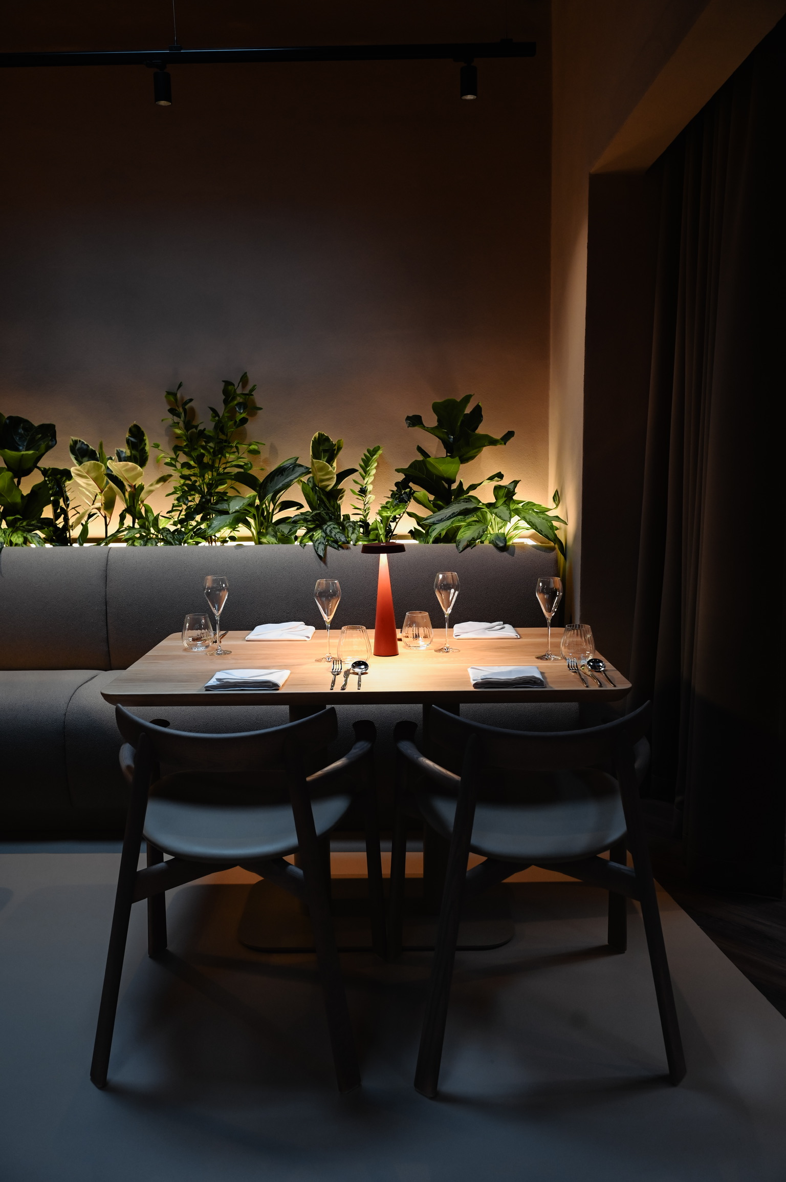Večer se restaurace promění díky ambientnímu osvětlení v tajuplné, až magické místo, které vybízí ke zpomalení, prožitku a vnímání detailů. Světlo zvýrazňuje struktury materiálů a dodává celému prostoru pocit živosti a harmonie.