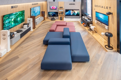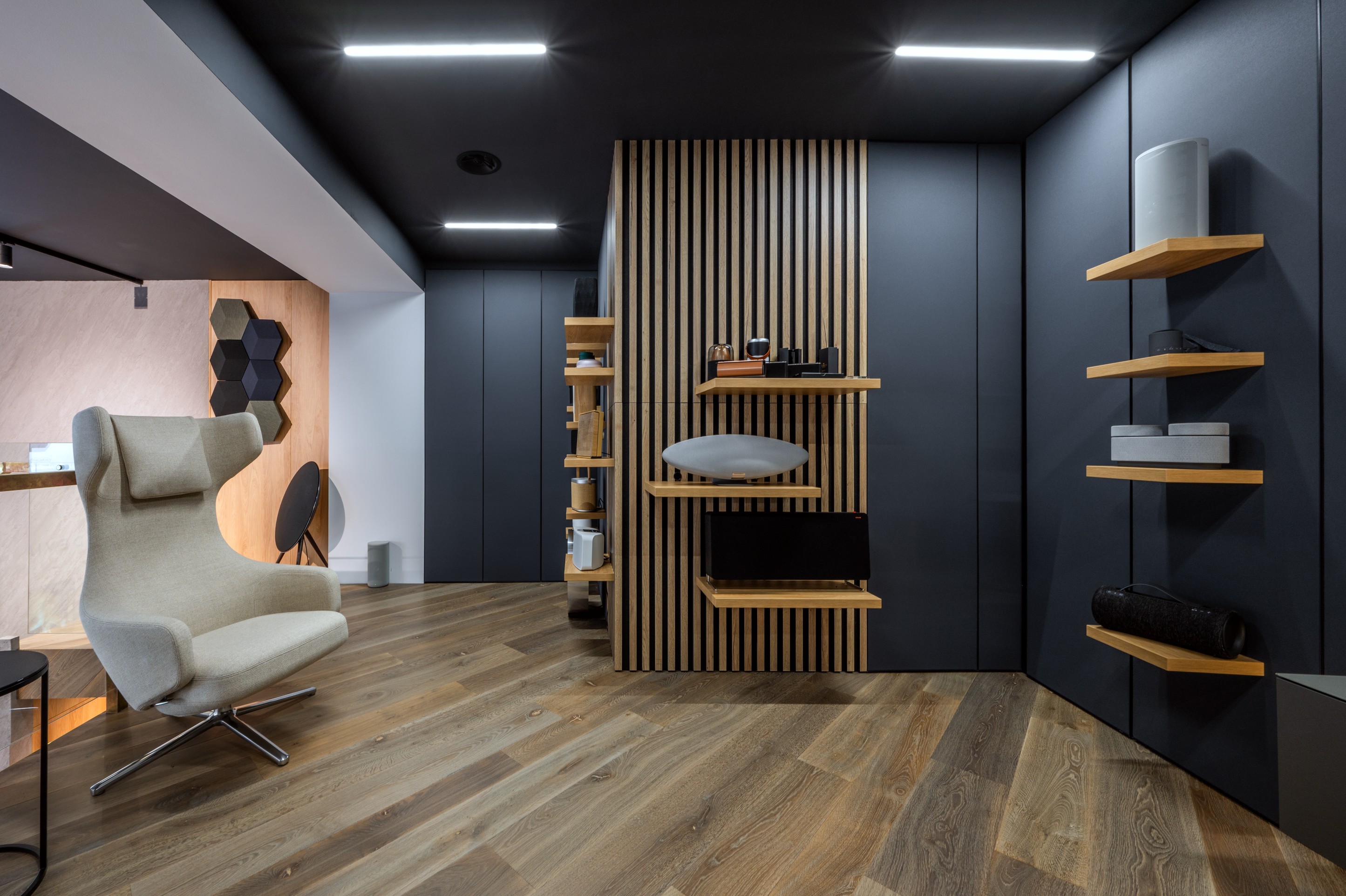 Interiér sjednocuje dubový dekor Hickory, jehož přírodní odstín dodává prostoru teplo a hloubku. Mosazné akcenty, perforovaný tahokov i pódia na míru pak vytvářejí technicky i esteticky působivý celek. K drobným, ale výrazným detailům patří i dřevěné koule z masivu dubu, na nichž spočívají sluchátka – funkční prvek, který propojuje řemeslnou preciznost s elegancí.