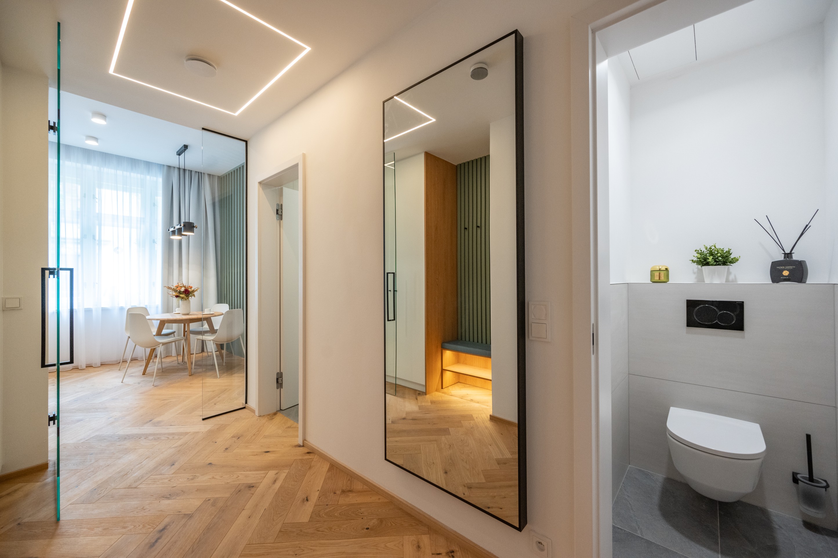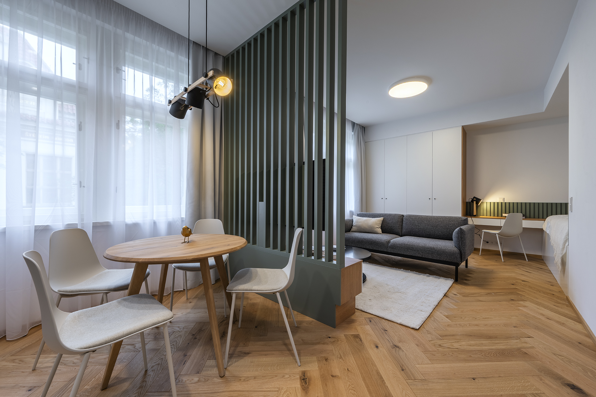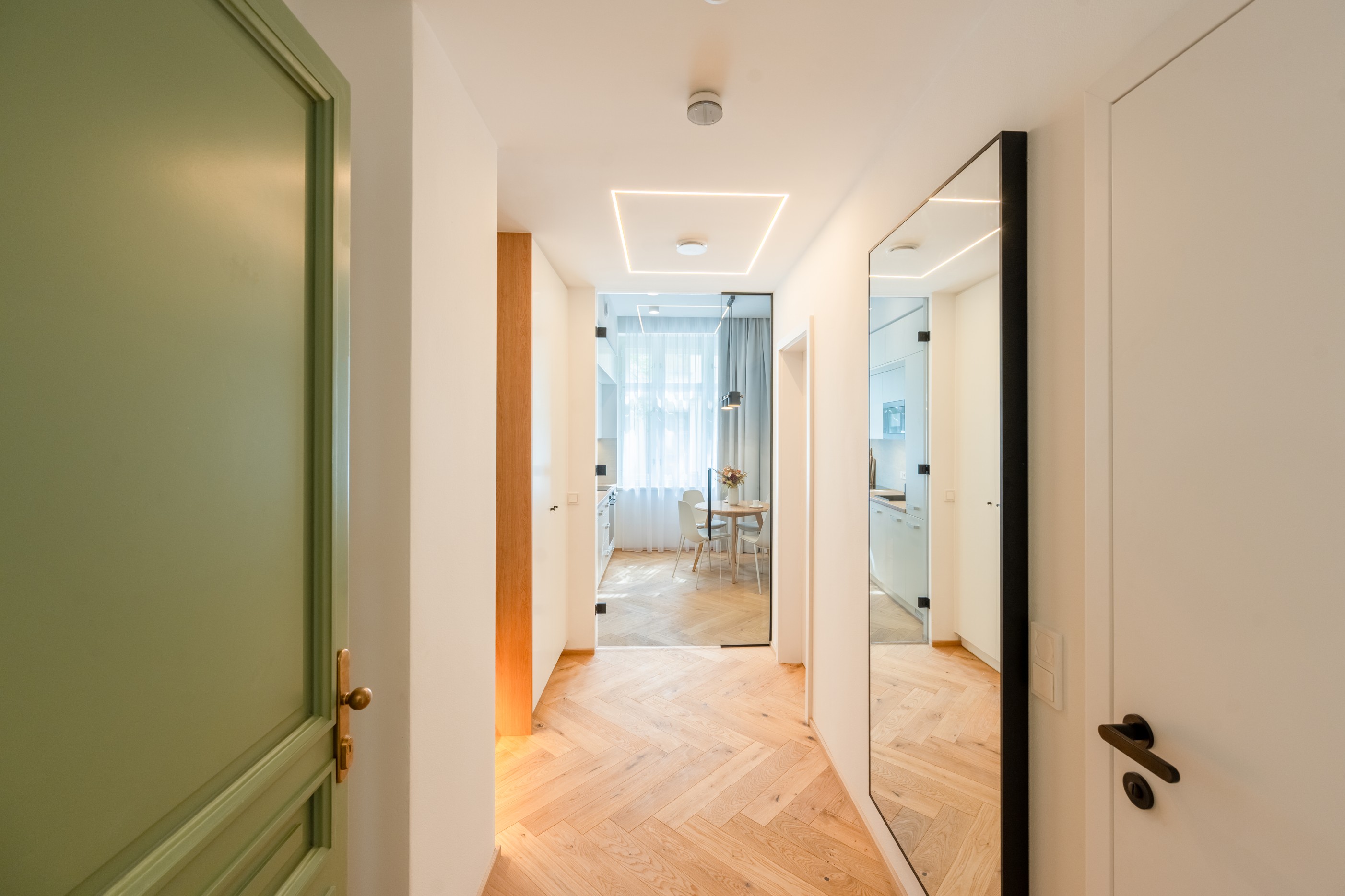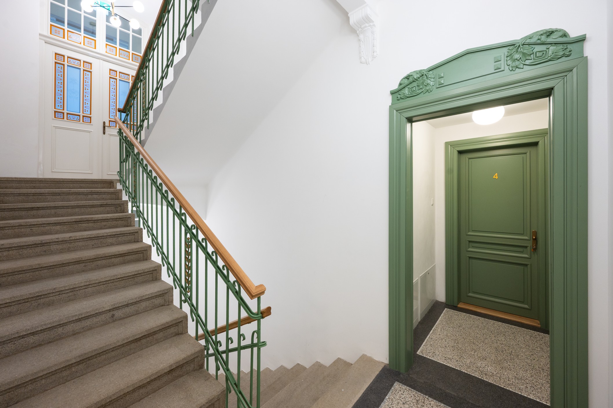 Klíčové bylo zachovat původní prvky a zároveň pracovat s materiály, které charakter domu citlivě doplňují. „Při návrhu moderního interiéru do historické budovy je zásadní respektovat původní architektonické detaily a vyvarovat se zásahů, které by narušily prostorovou nebo estetickou kontinuitu – například do fasád, schodišť či členění interiéru. Naopak je nutné držet principy harmonické kompozice, kde soudobé materiály, barevné akcenty a vylepšené dispozice doplňují historickou strukturu a propojují minulost se současností,“ vysvětluje Aneta Rybníčková z kanceláře KYZLINK ARCHITECTS.