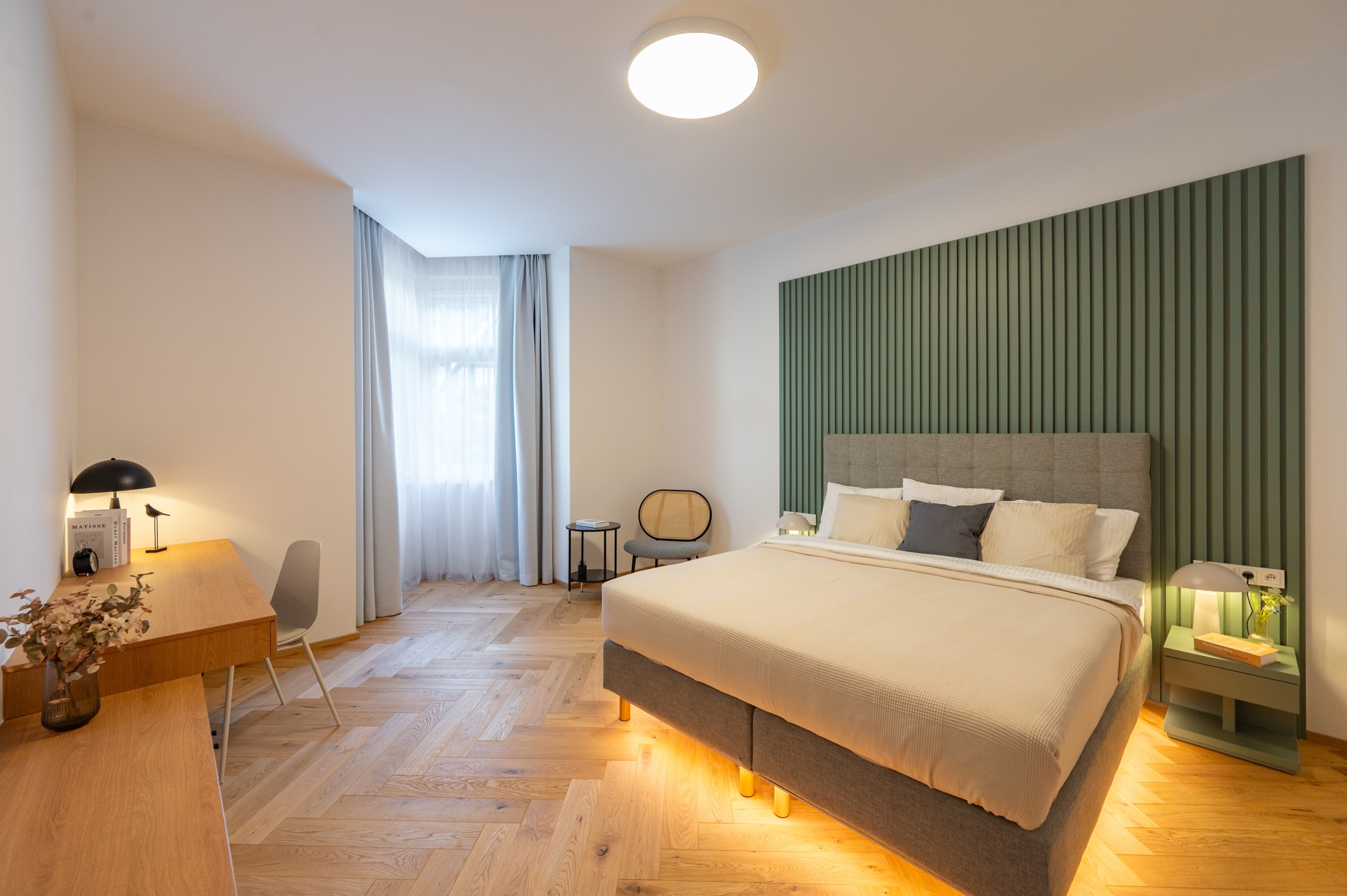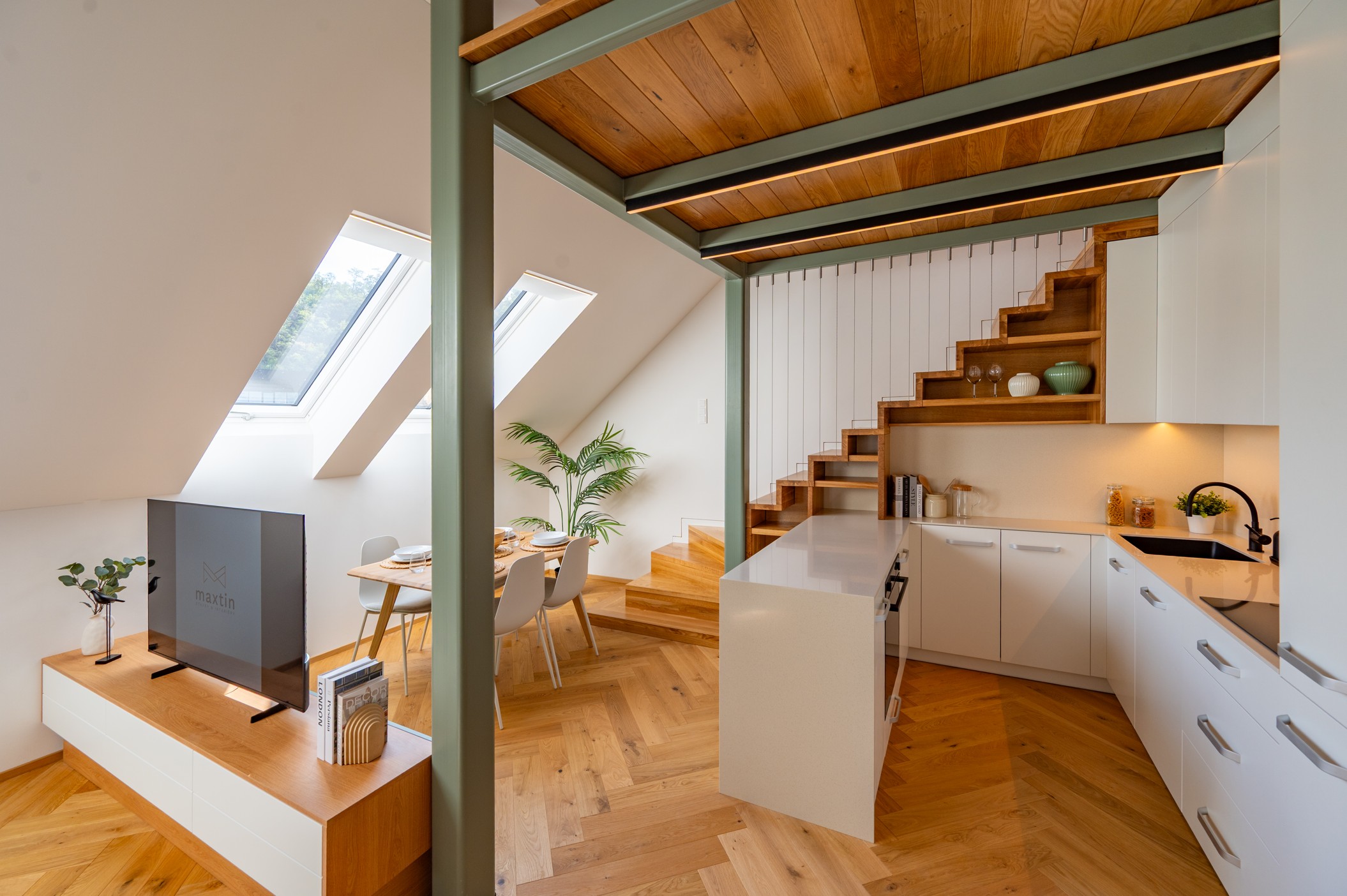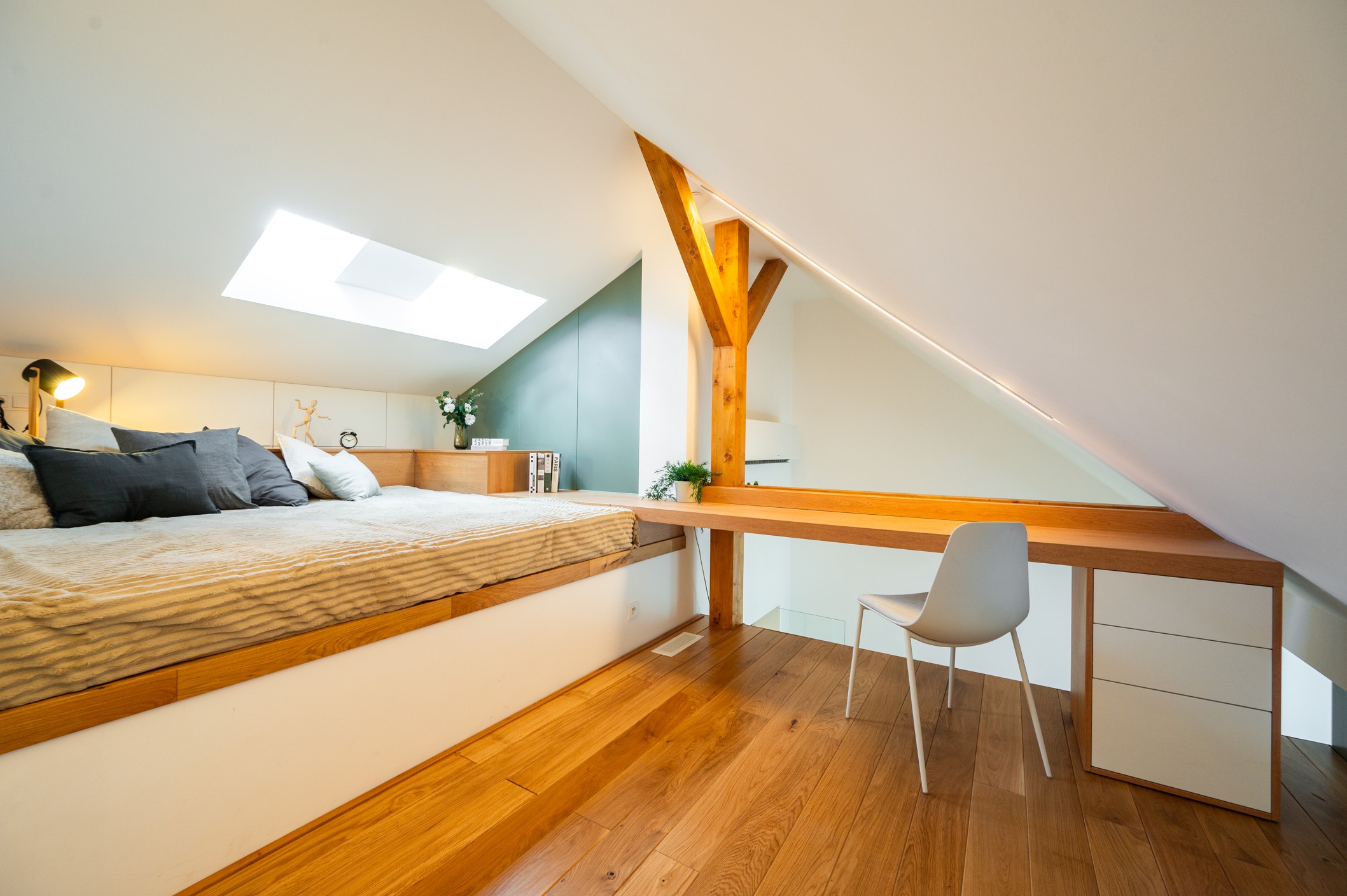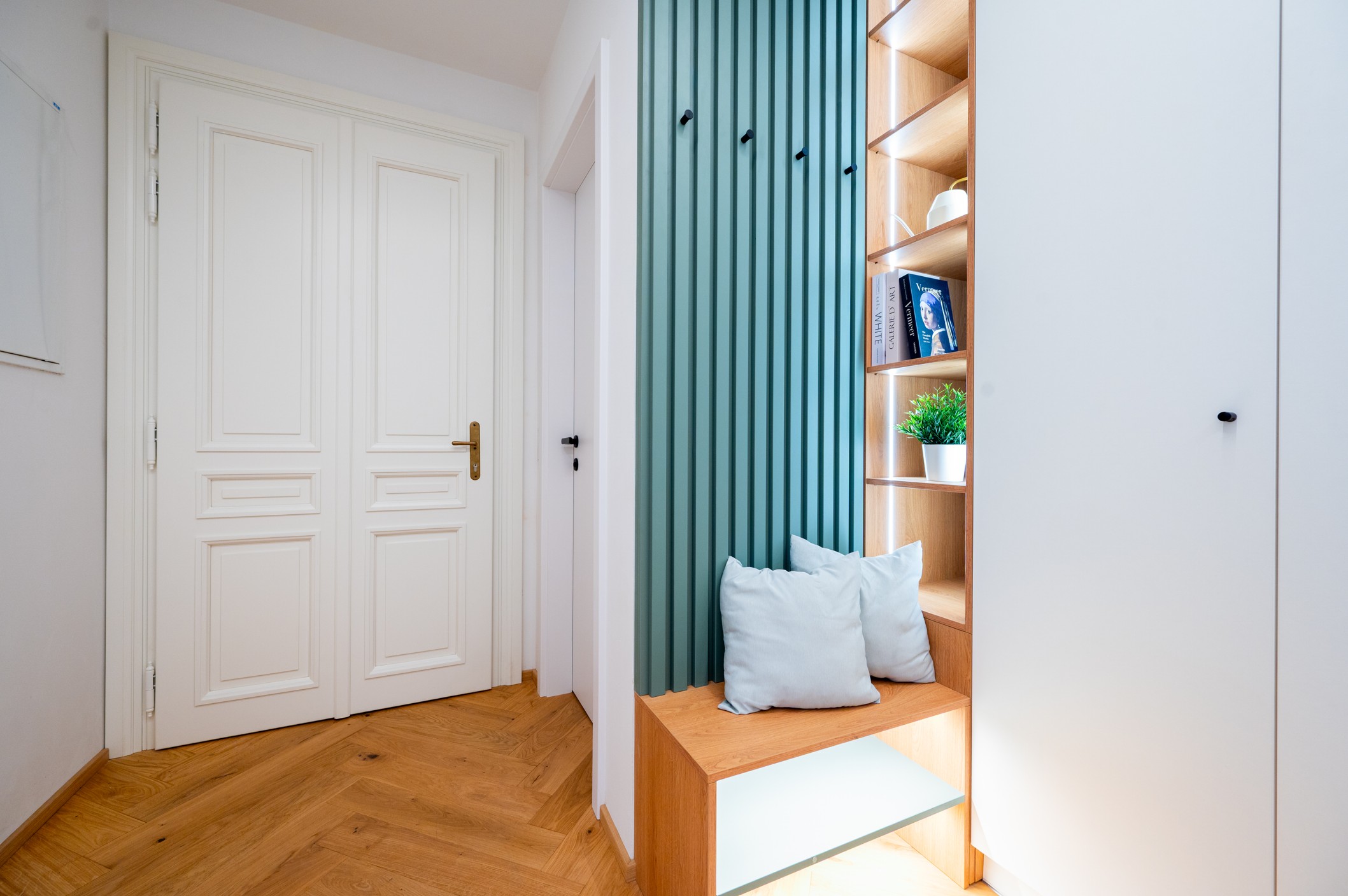 Klíčové bylo zachovat původní prvky a zároveň pracovat s materiály, které charakter domu citlivě doplňují. „Při návrhu moderního interiéru do historické budovy je zásadní respektovat původní architektonické detaily a vyvarovat se zásahů, které by narušily prostorovou nebo estetickou kontinuitu – například do fasád, schodišť či členění interiéru. Naopak je nutné držet principy harmonické kompozice, kde soudobé materiály, barevné akcenty a vylepšené dispozice doplňují historickou strukturu a propojují minulost se současností,“ vysvětluje Aneta Rybníčková z kanceláře KYZLINK ARCHITECTS.