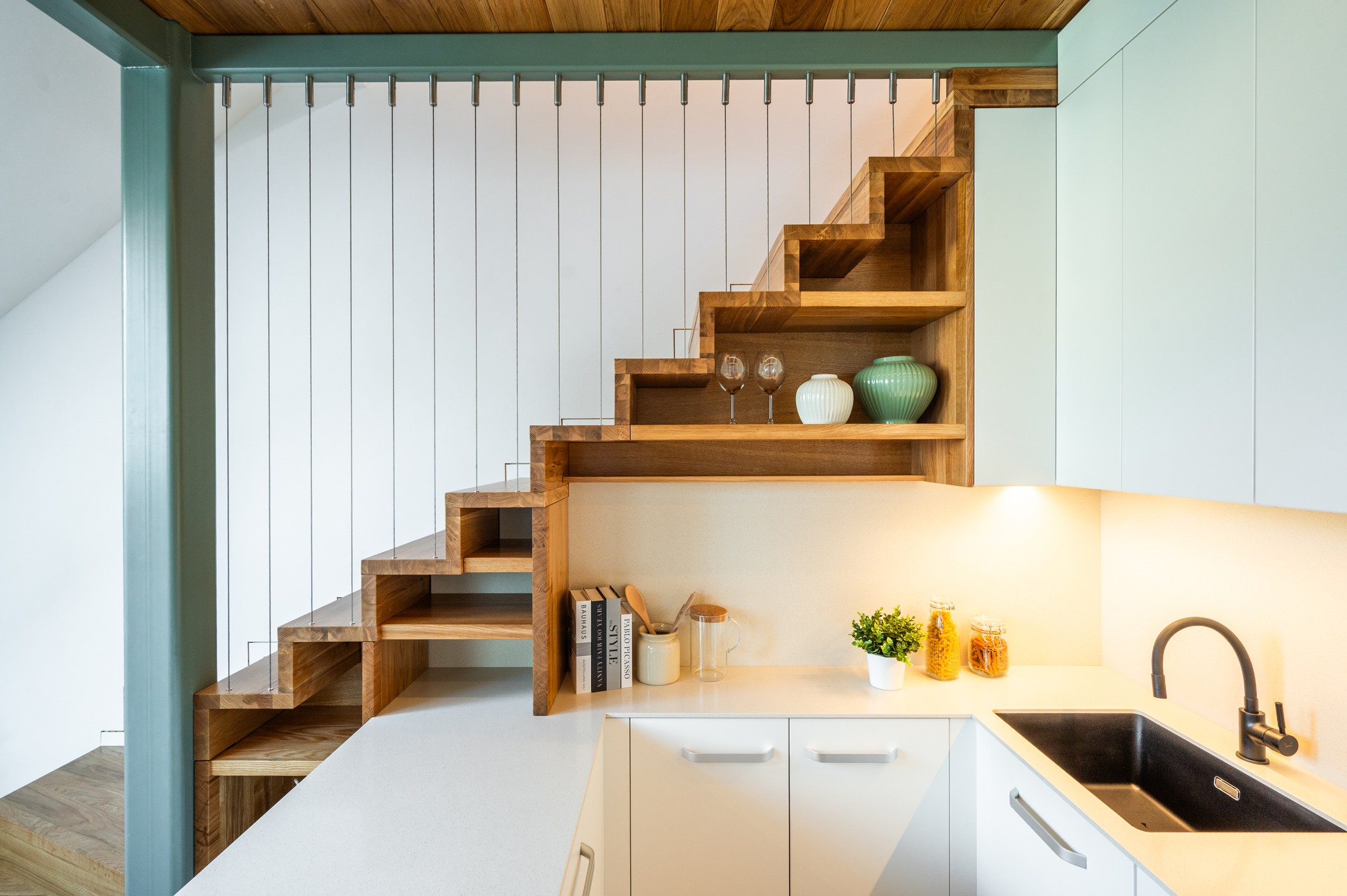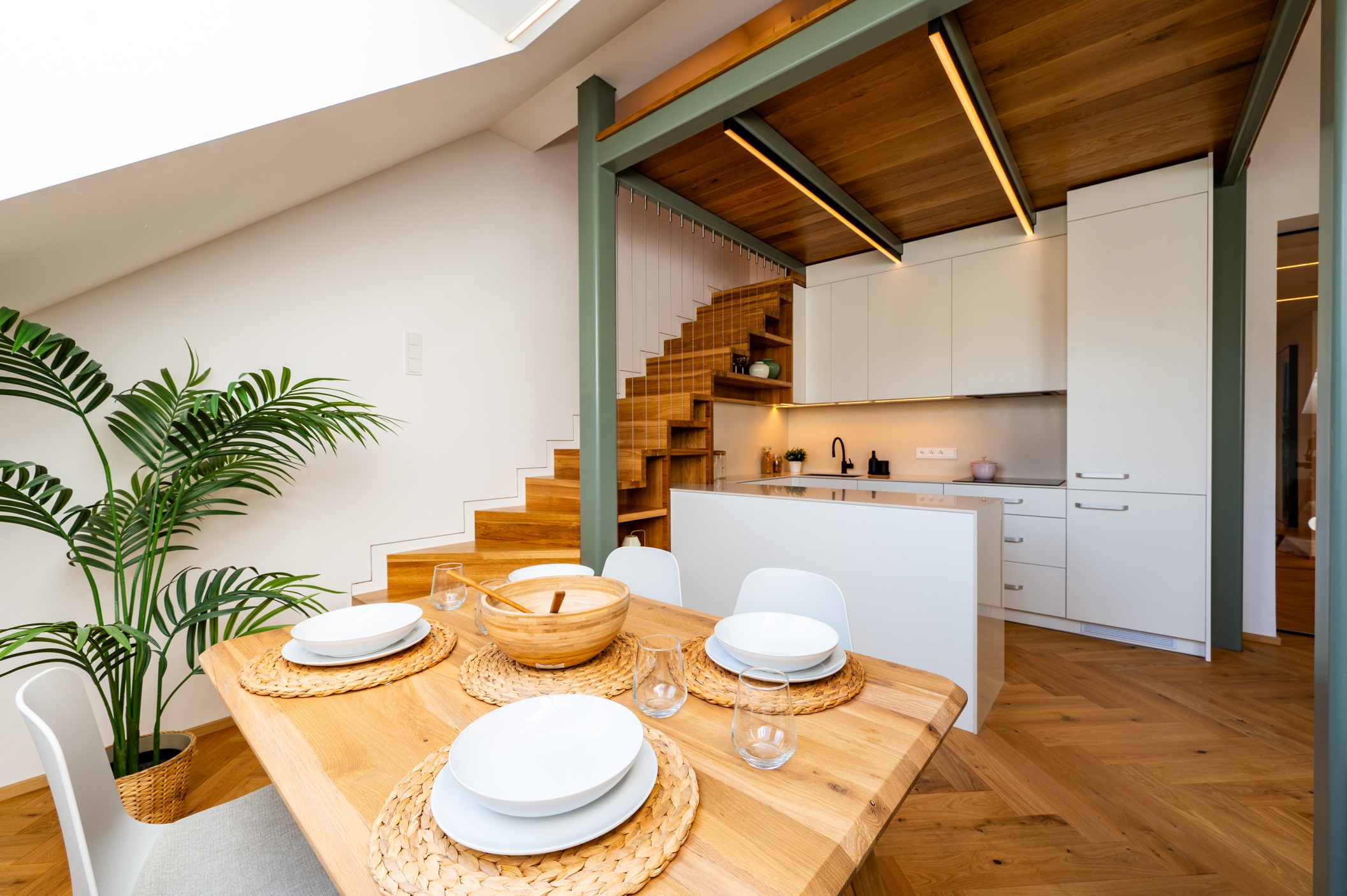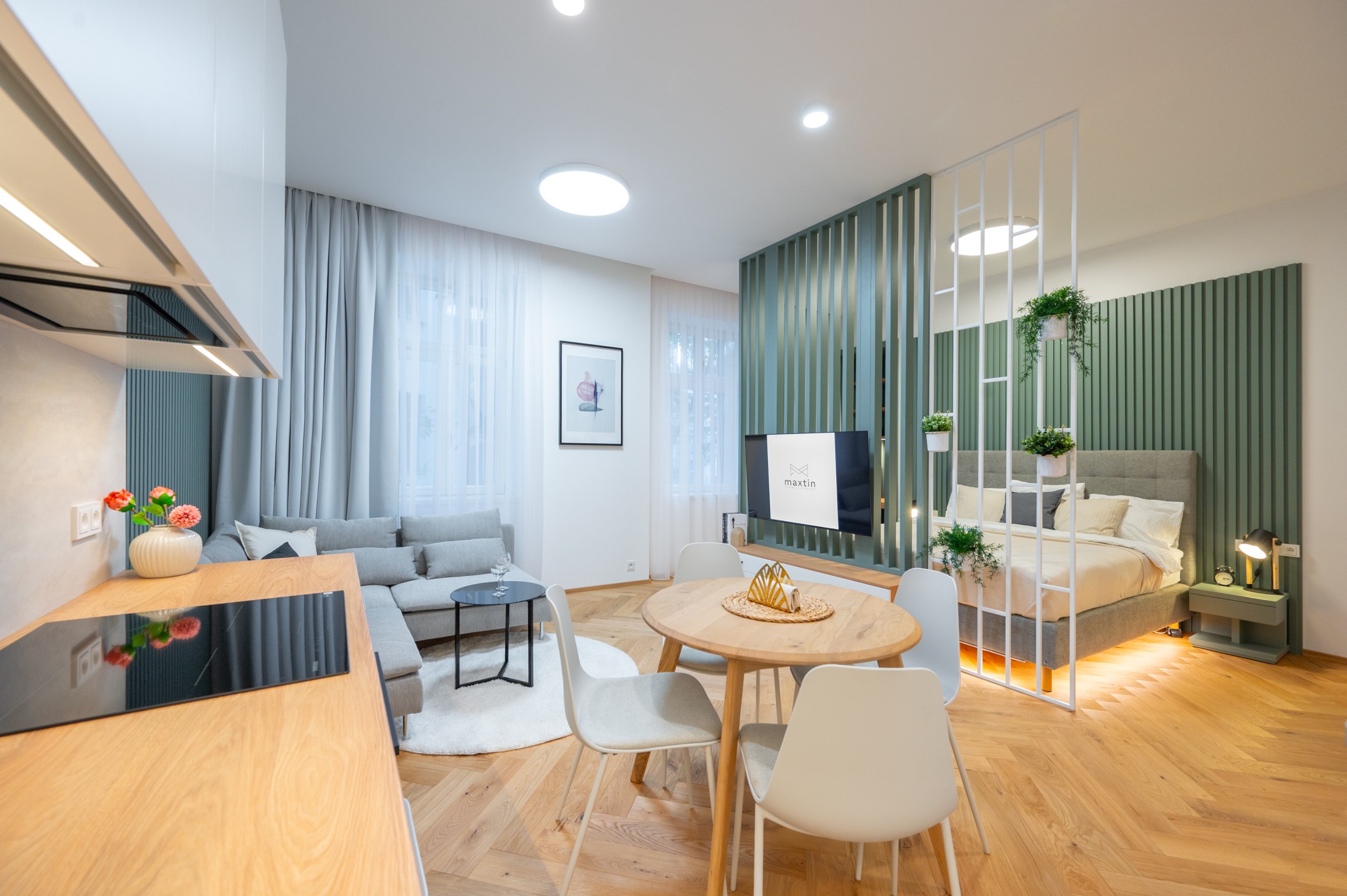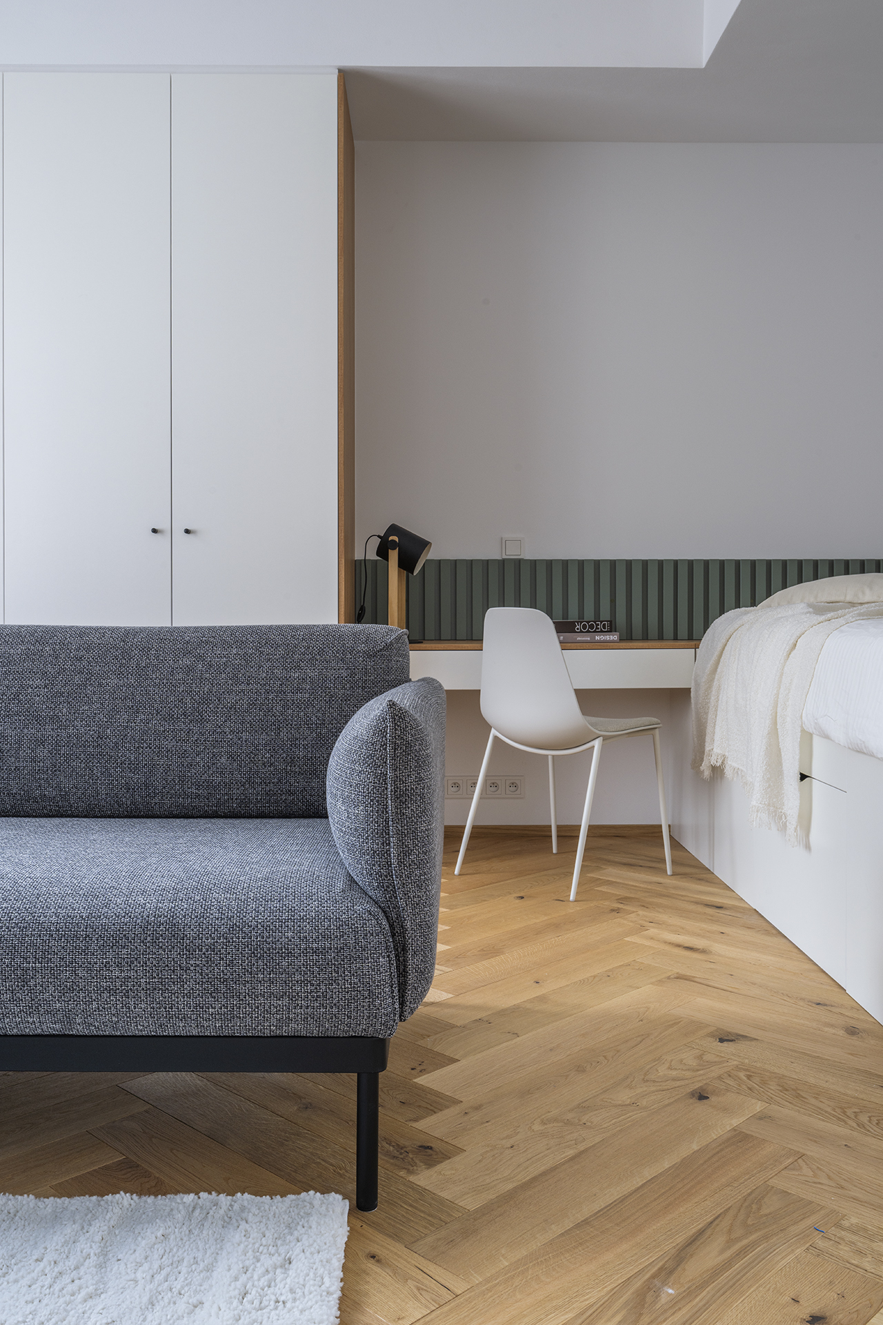 Klíčové bylo zachovat původní prvky a zároveň pracovat s materiály, které charakter domu citlivě doplňují. „Při návrhu moderního interiéru do historické budovy je zásadní respektovat původní architektonické detaily a vyvarovat se zásahů, které by narušily prostorovou nebo estetickou kontinuitu – například do fasád, schodišť či členění interiéru. Naopak je nutné držet principy harmonické kompozice, kde soudobé materiály, barevné akcenty a vylepšené dispozice doplňují historickou strukturu a propojují minulost se současností,“ vysvětluje Aneta Rybníčková z kanceláře KYZLINK ARCHITECTS.